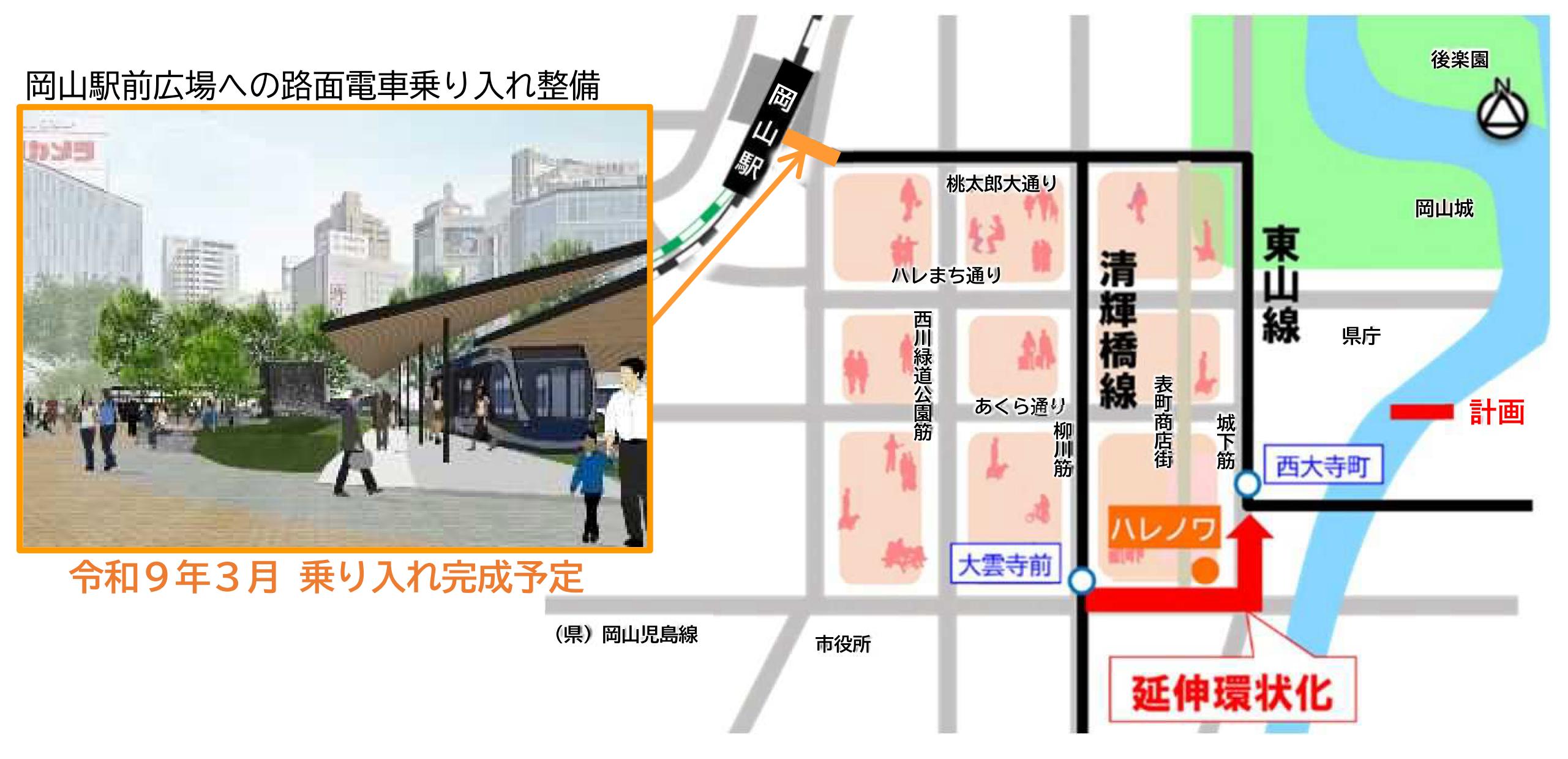 路面電車の延伸環状化(大雲寺前〜ハレノワ〜西大寺町間)について事業計画案がまとまりましたのでお知らせします|岡山市