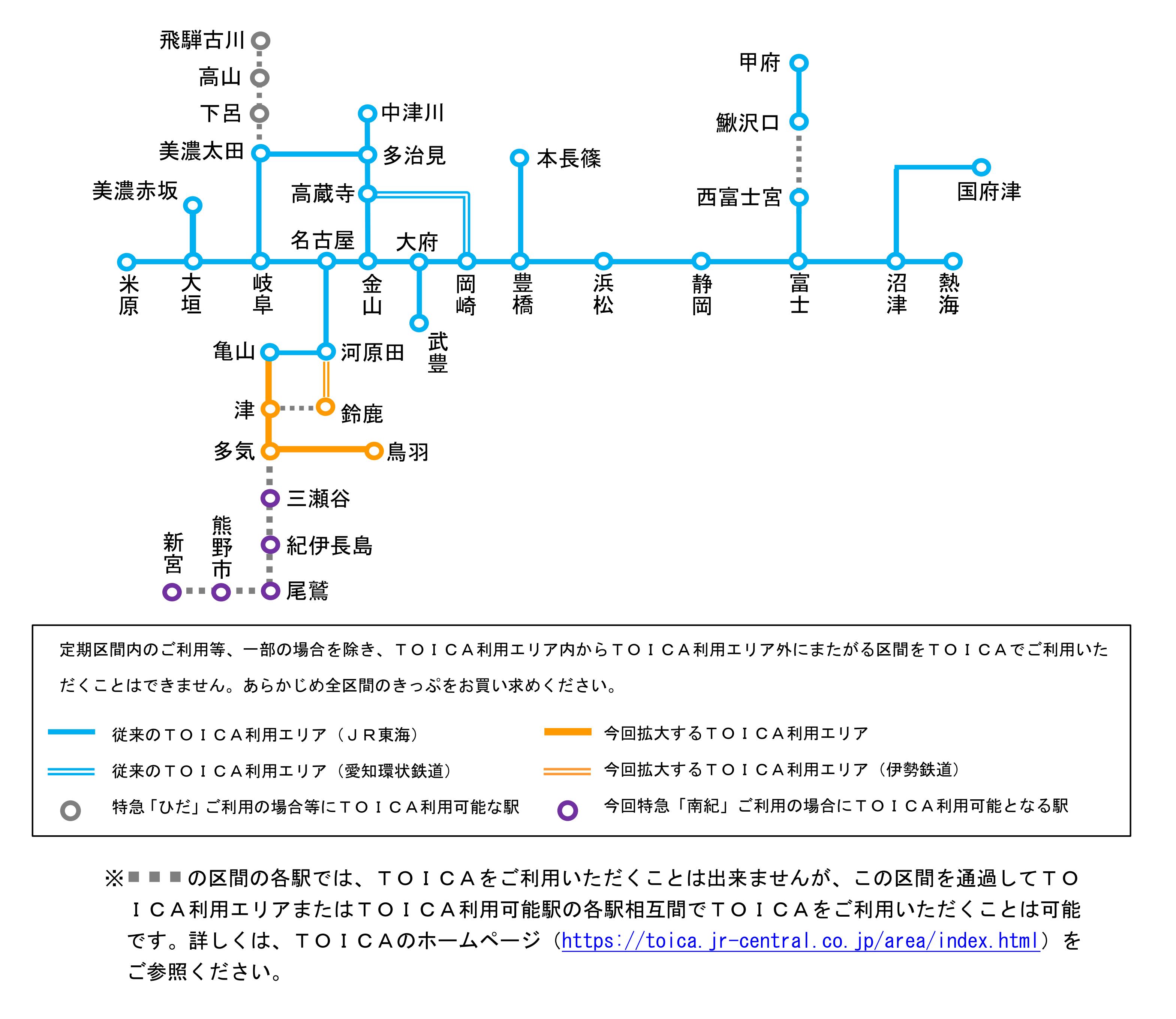 ・TOICA利用エリア各駅に加え、紀勢本線の三瀬谷、紀伊長島、尾鷲、熊野市、新宮の5駅において、特急「南紀」利用の場合にTOICAが利用可能に