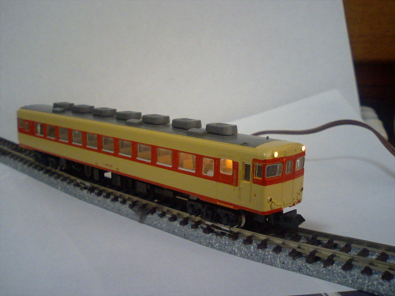 取り付け自体は、さほど難しくないはずなのですが、最後の車両の組み立てで苦心し、ようやく取り付けてレールの上で試験点灯させてみたら、これがまた点灯しないので、内部の接触を確認したり・・・と約1時間くらい格闘(?)してやっとのこと、できあがりました。(写真参照)