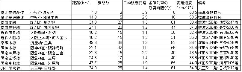 さすがに各社の最優等列車は、表定速度は泉北高速の各停・準急よりも速いのですが、次位の優等列車と比較してみると、泉北各停・準急の方が速い場合もあります。