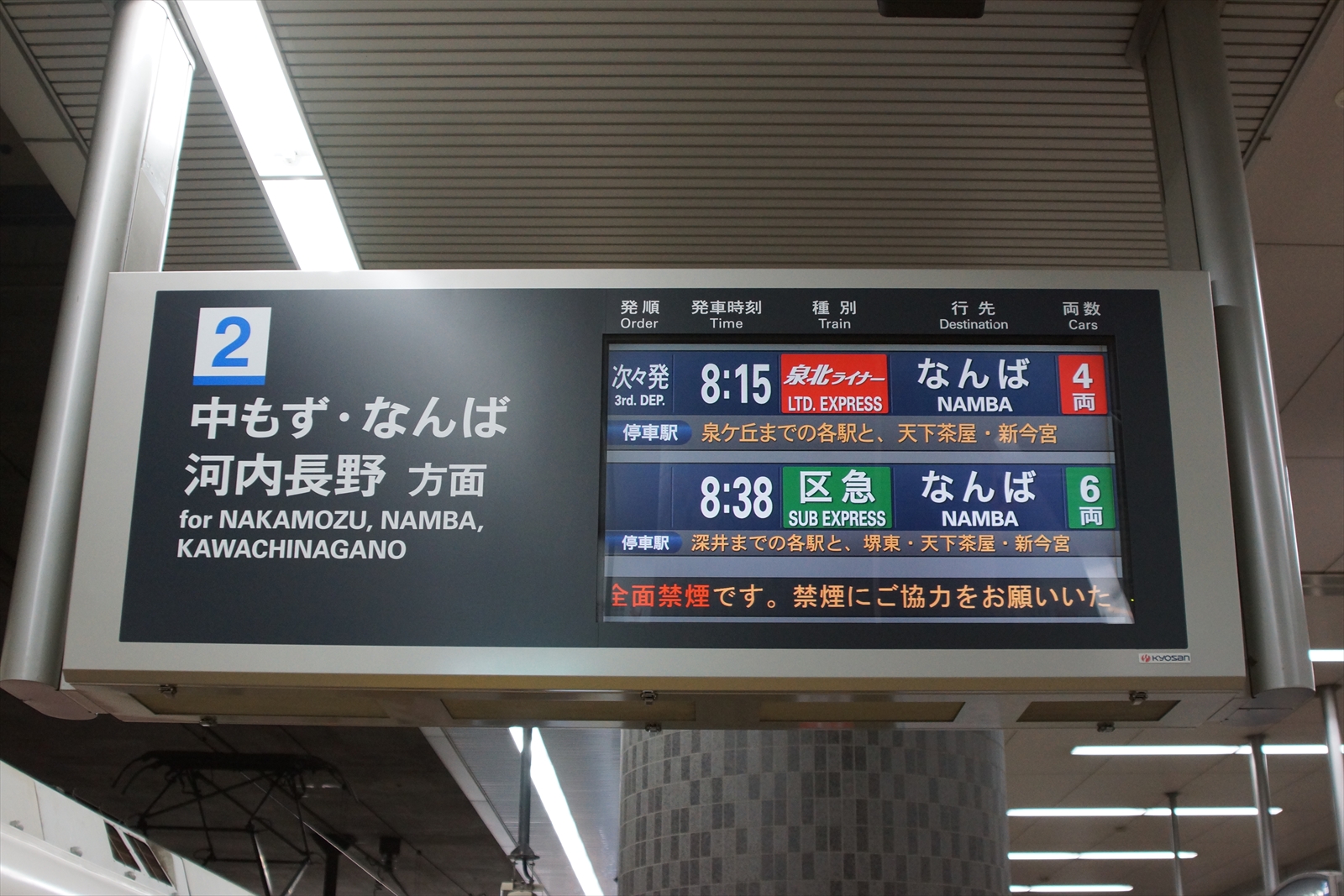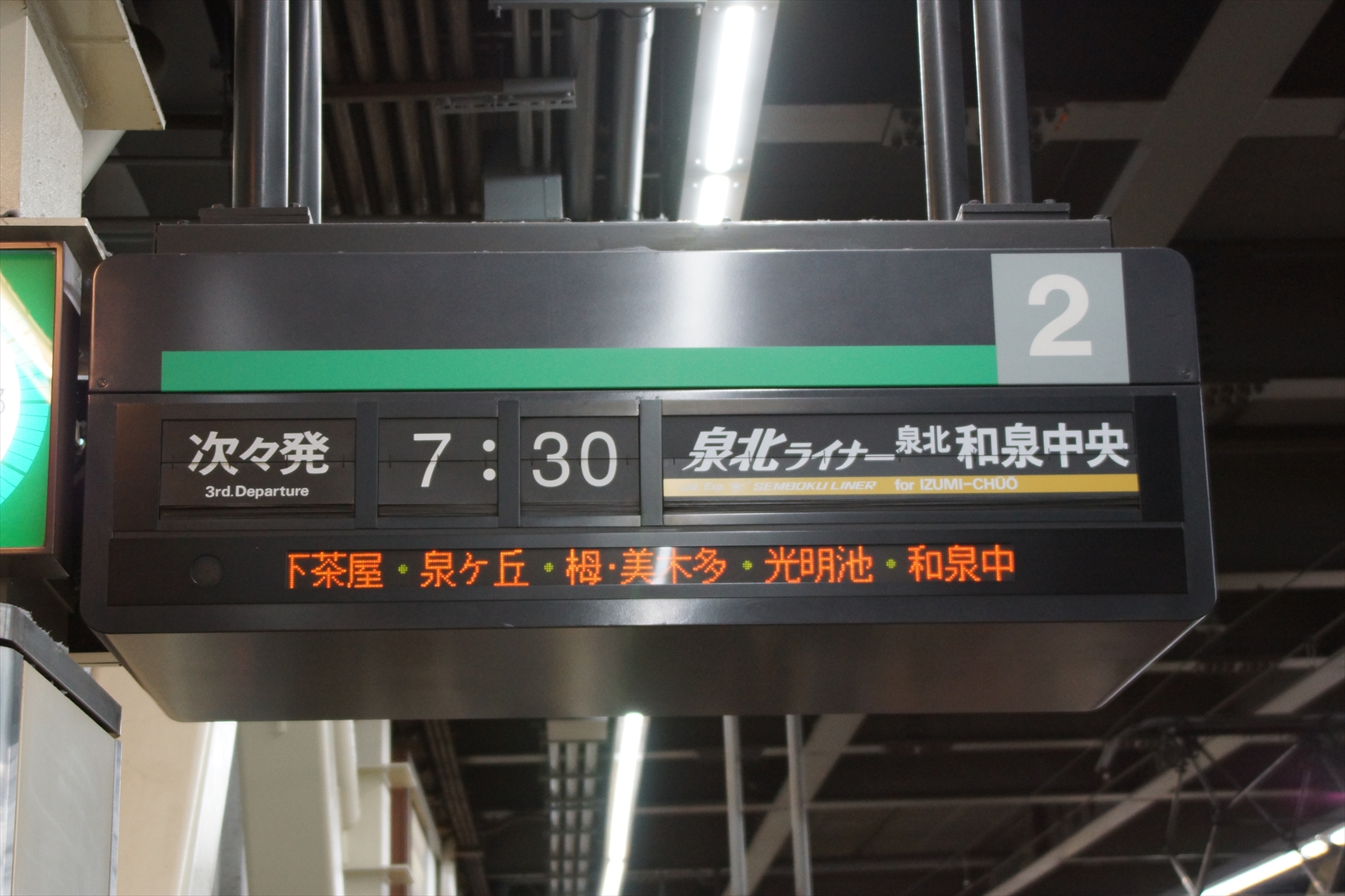 2番線の発着で、「泉北ライナー」は金色の表示となっています。