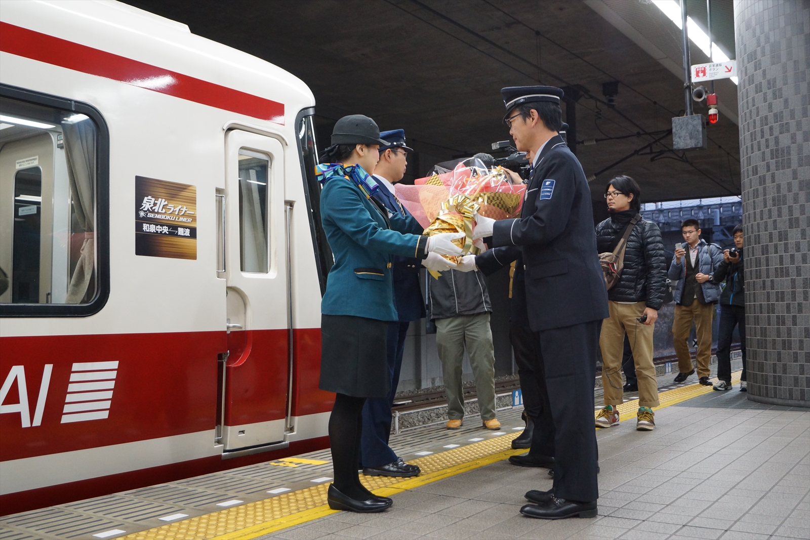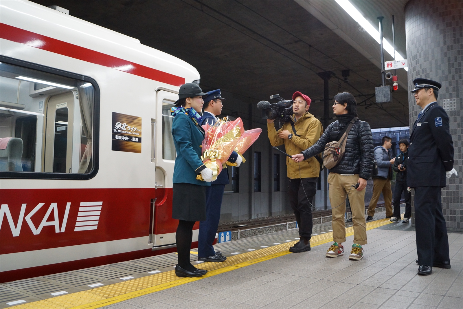 しばらくすると、MBSのテレビカメラや泉北高速鉄道の社員の方などが集まってきて、初列車乗務員への花束贈呈がありました。