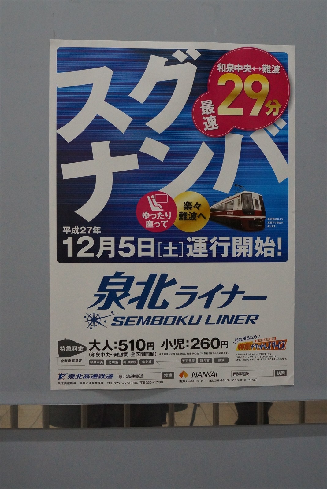 和泉中央駅には、本日の泉北ライナー運行開始の告知があちこちに掲示されていました。