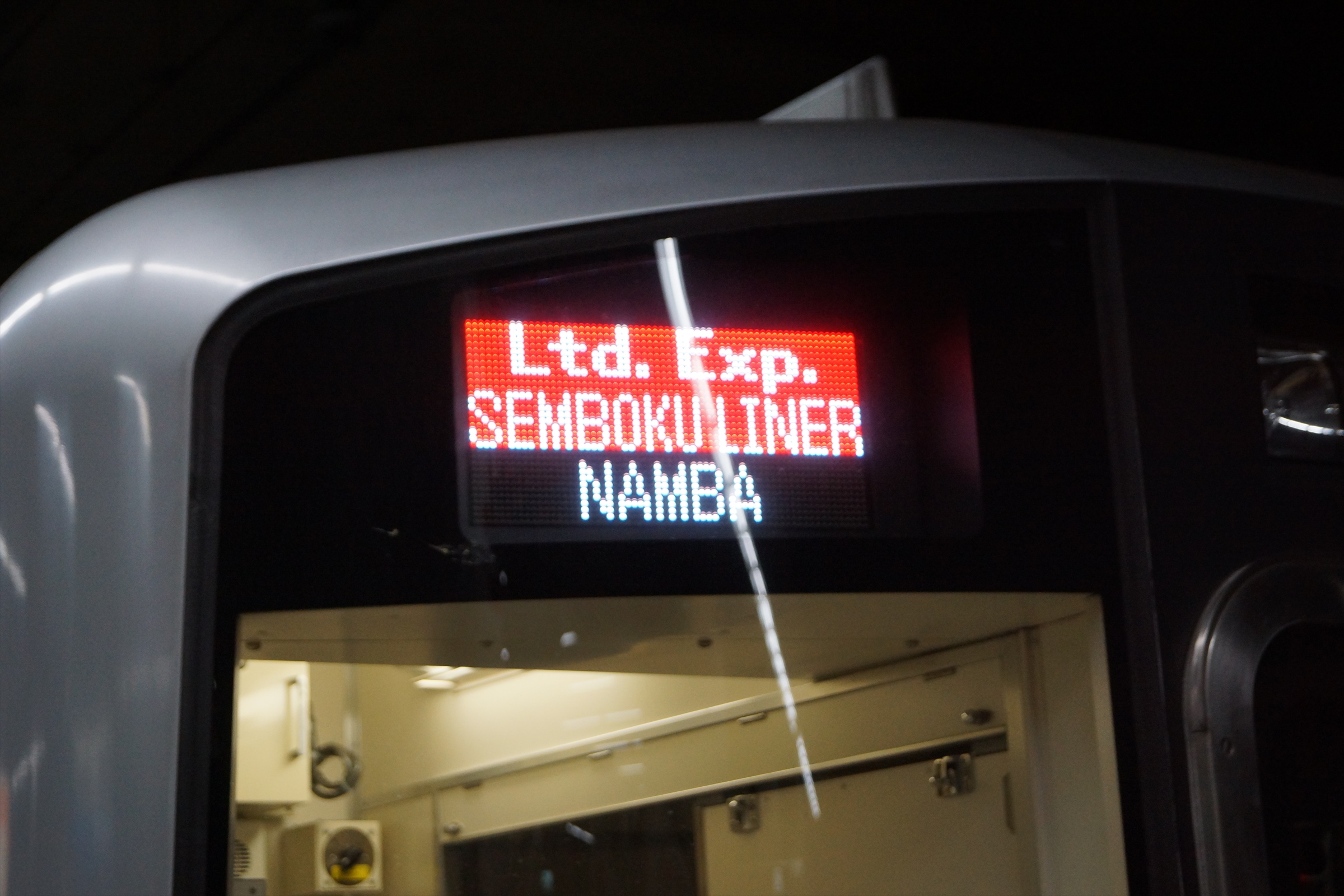 しかし「泉北ライナー」では12000系4両の運行となることから、このように「サザン・プレミアム」のステッカーが貼っていない貫通扉の姿をみることができます。