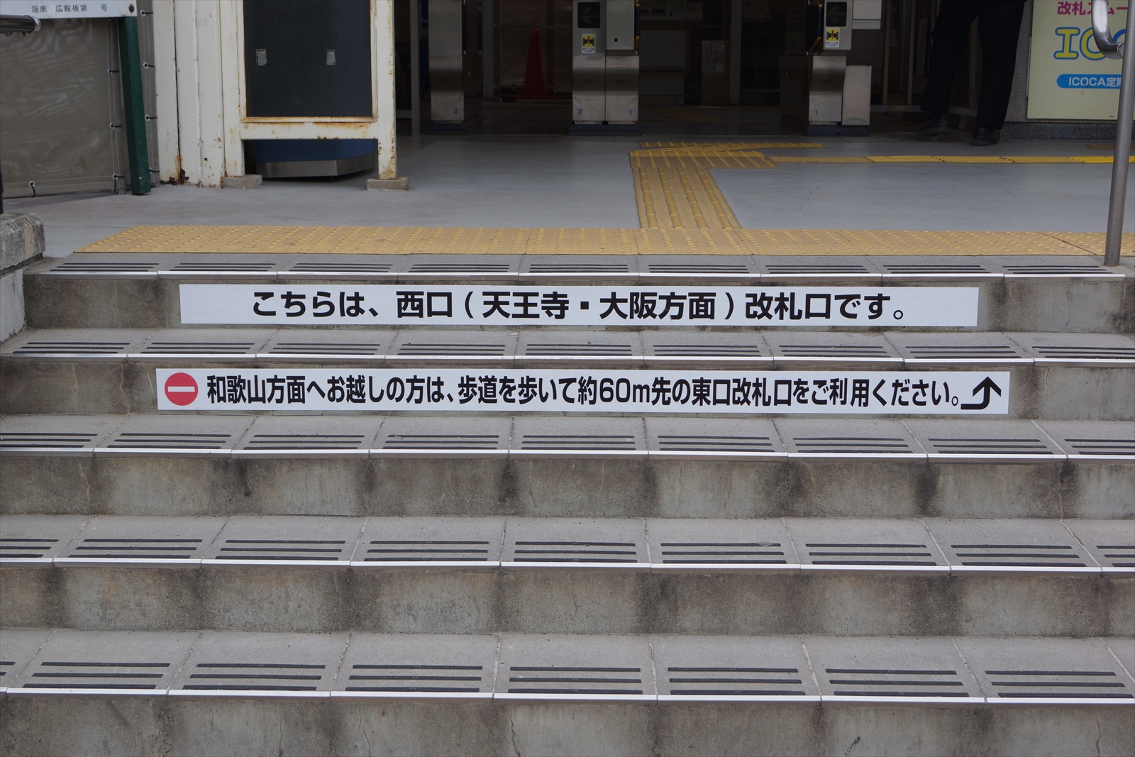 本日から天王寺・大阪方面のみの改札口となったので、階段の段差の部分に注意書きが貼られていました。