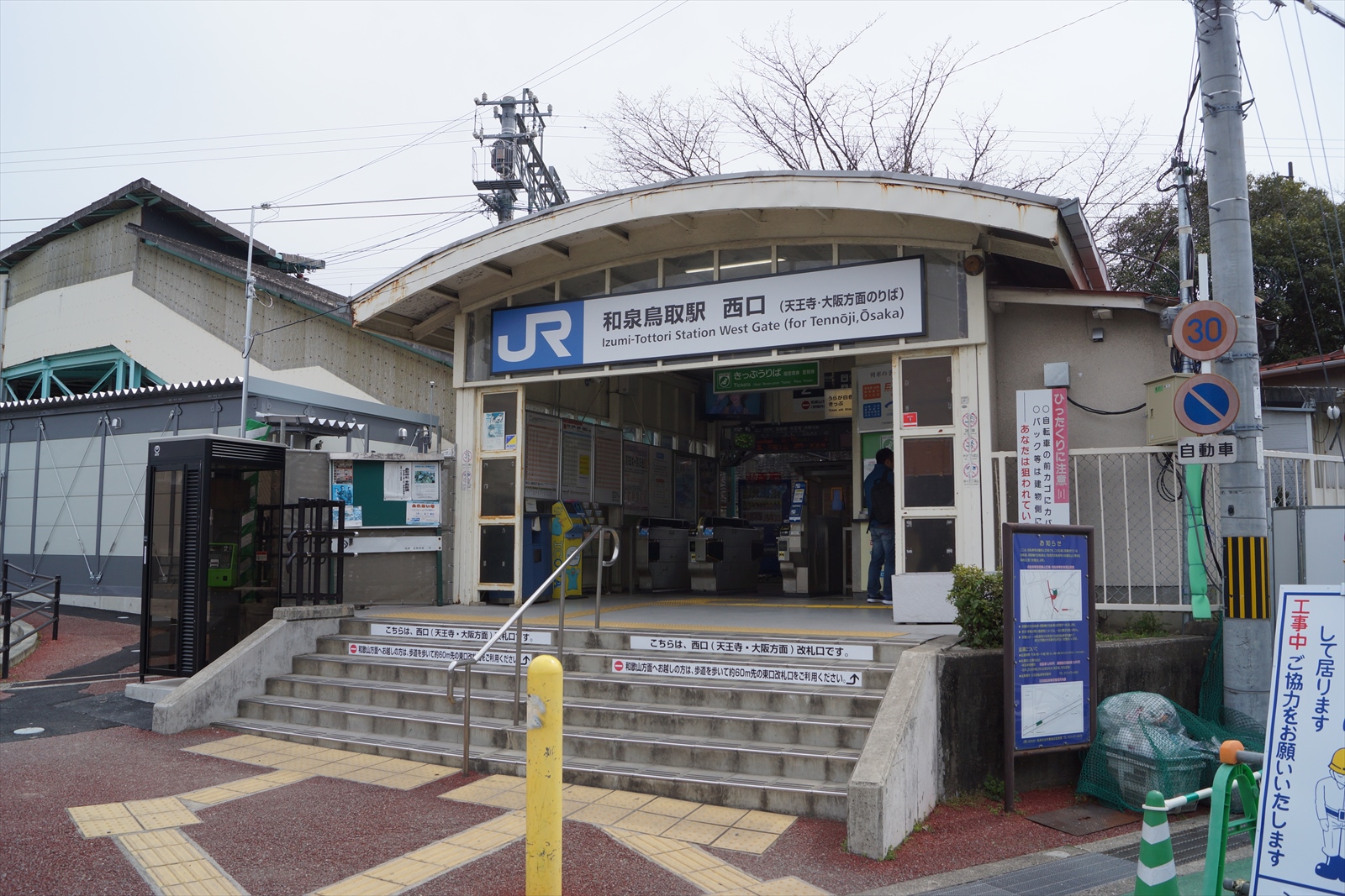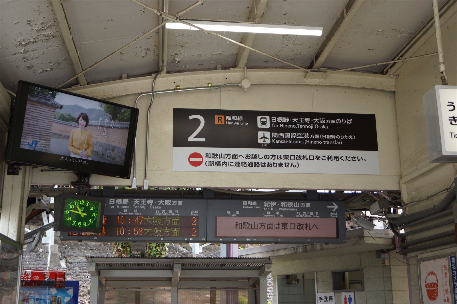 駅構内では、これまで表示されていた和歌山方面の発車案内表示の使用が中止され、東口改札口へ回る旨の案内が貼られていました。
