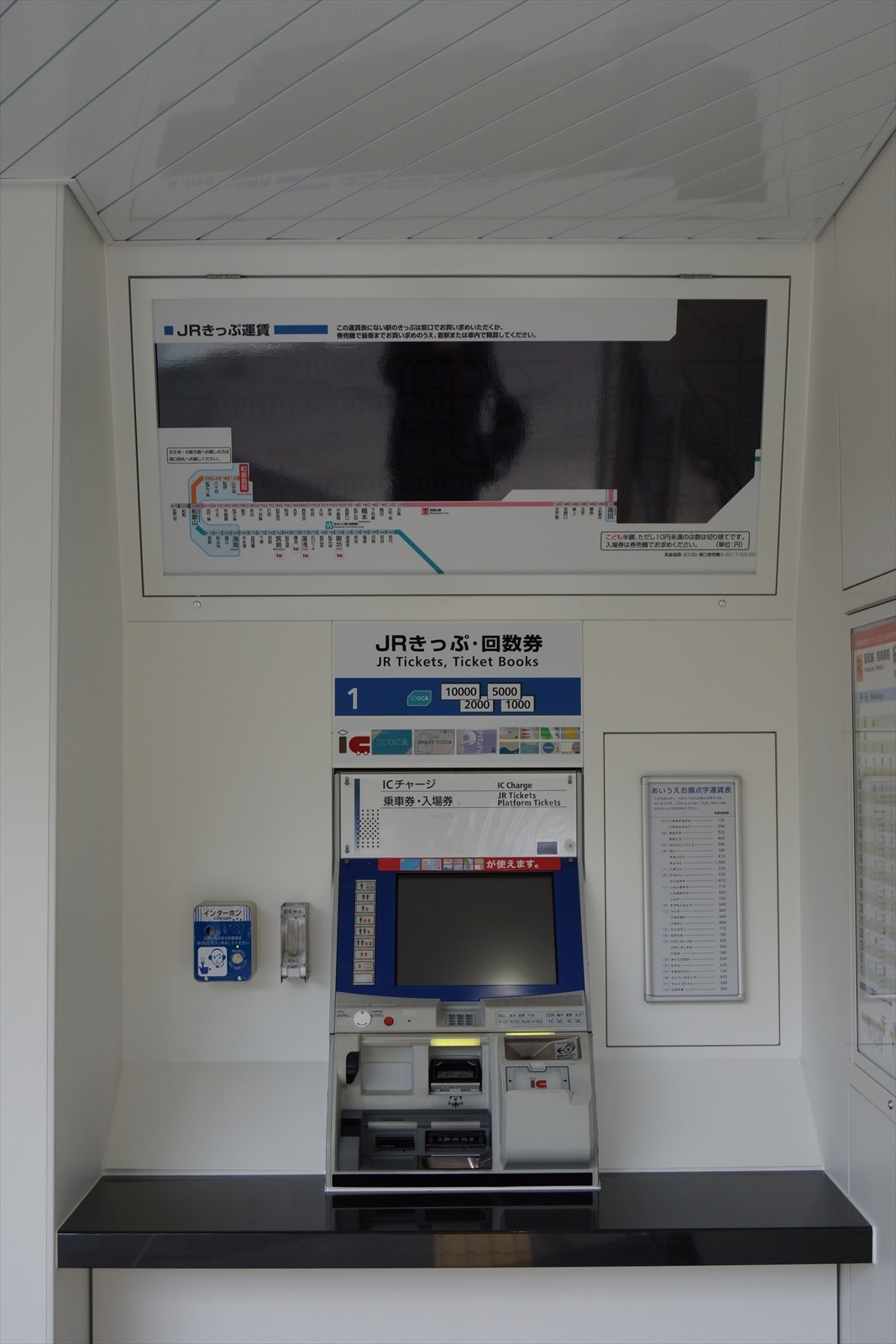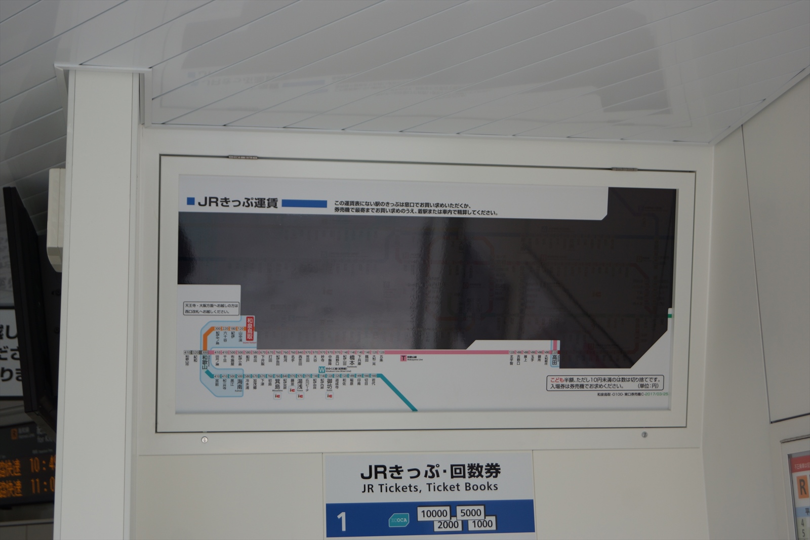 券売機上の運賃表では、誤って大阪方面のきっぷを購入しないように、和泉砂川以北の運賃は黒塗りで隠されていました。