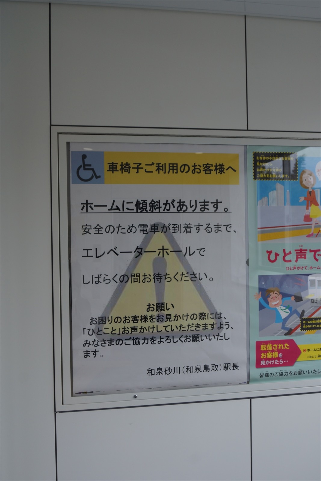 車いす利用者向けに、駅ホームの傾きに関する注意ポスターが掲示されています。