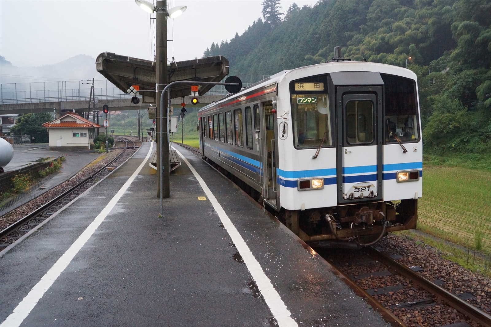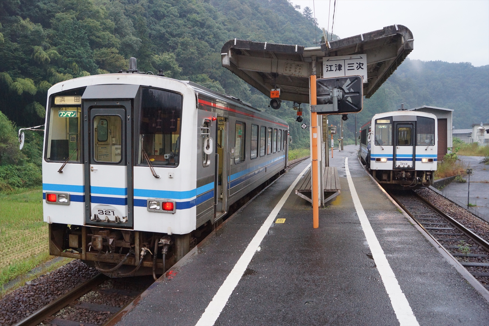 下り列車発車後、発車待ちをする浜田行きの列車。