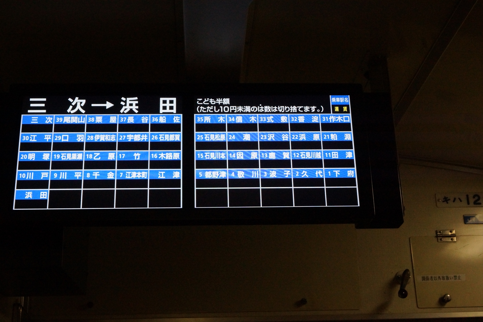三次からの運賃表。