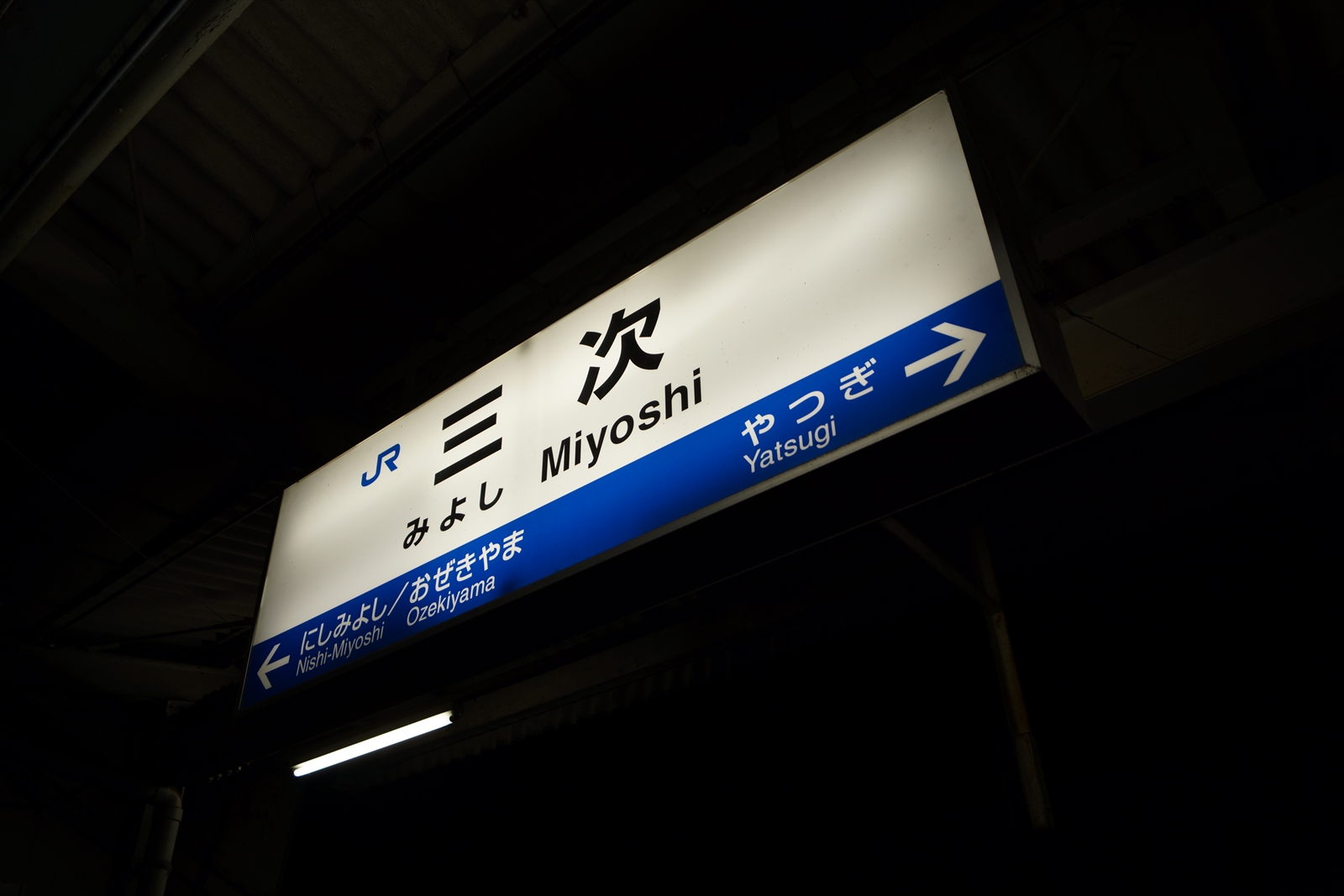 夜明け前の三次駅の駅名標。