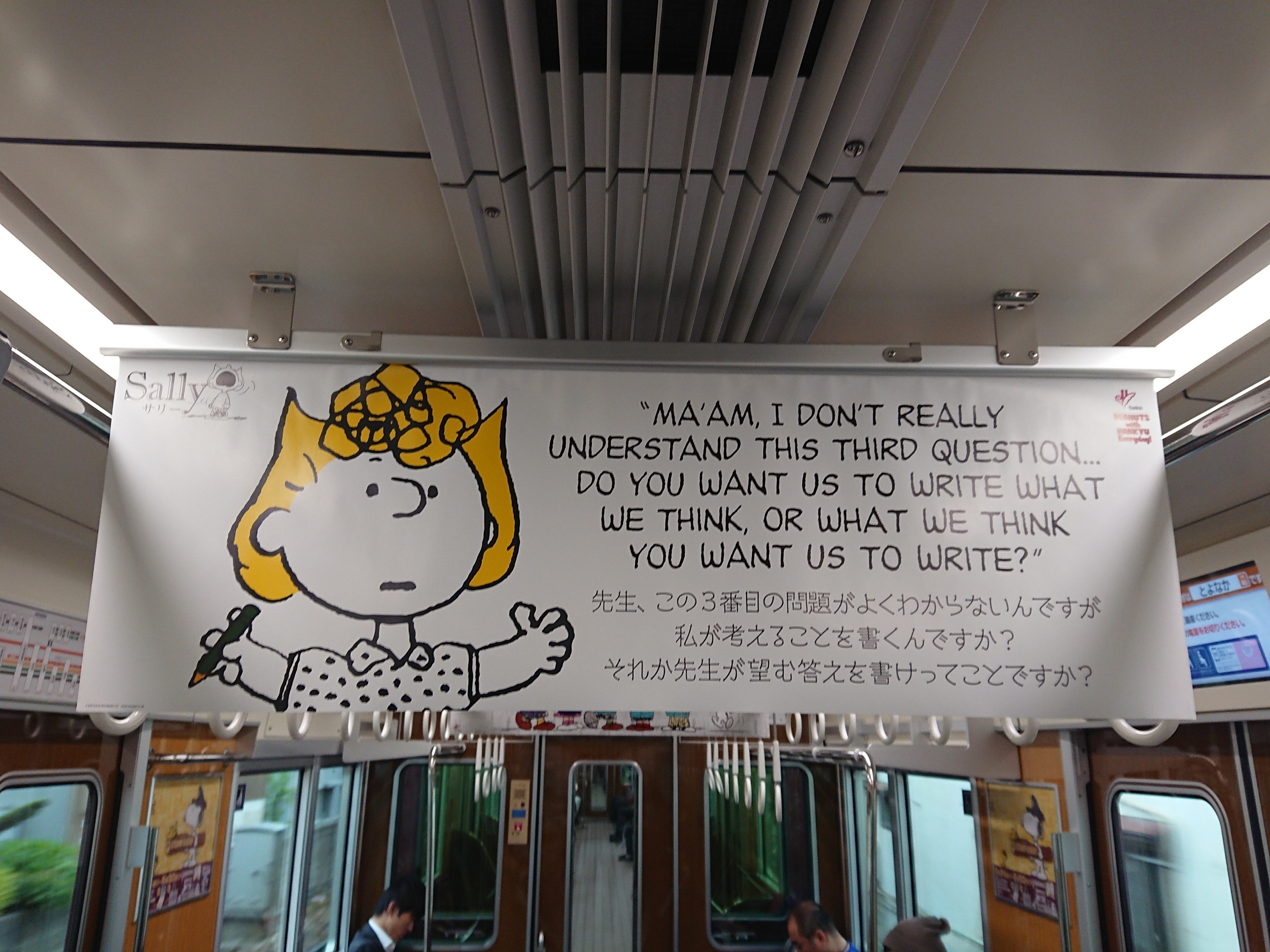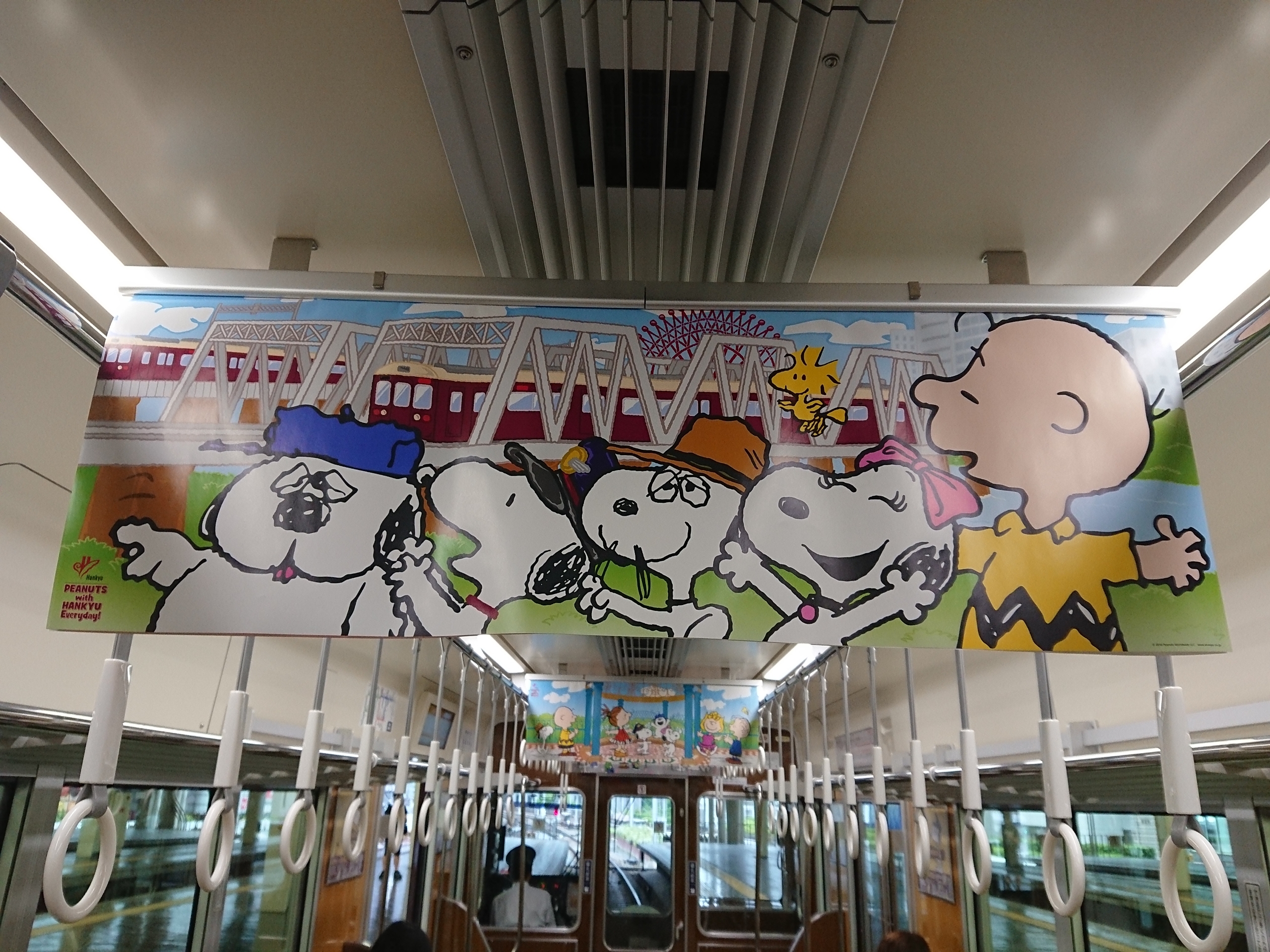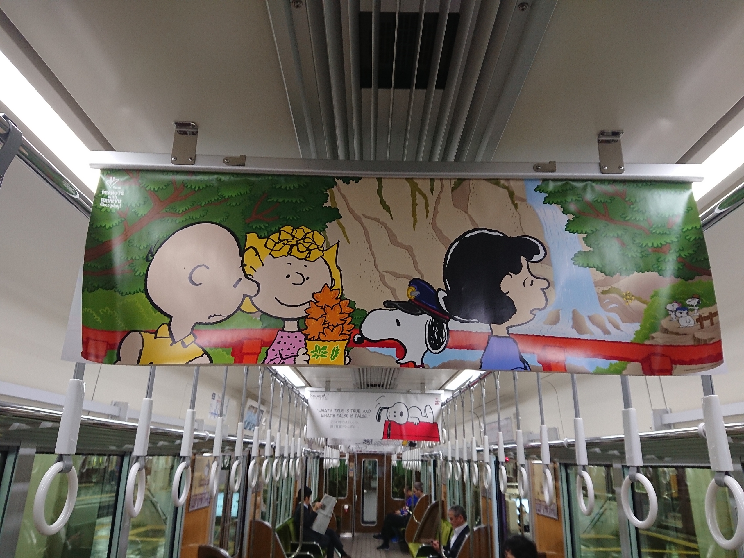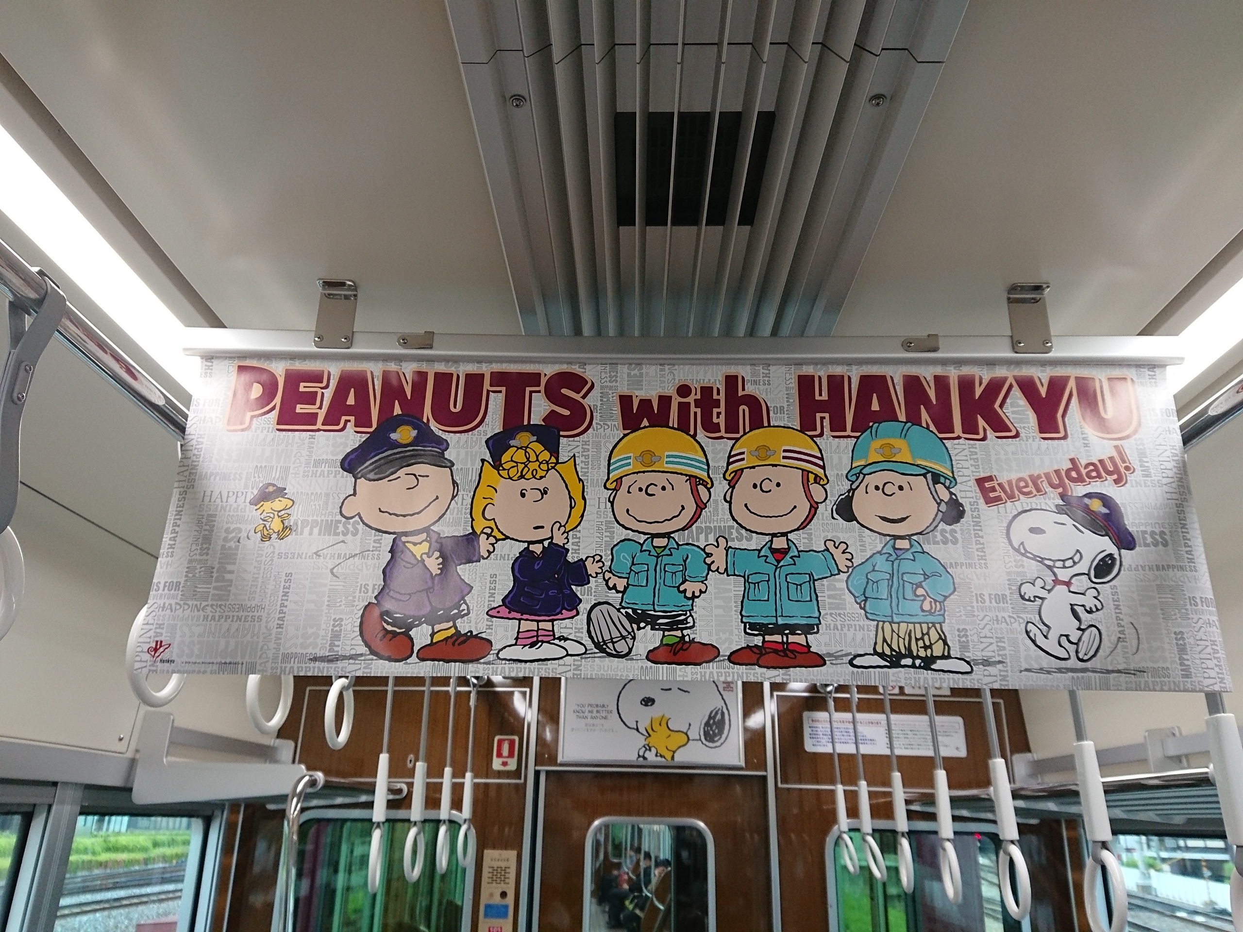 その他のデザインとしては、PEANUTS作品内での名言や、PEANUTSキャラクターが阪急グループの制服を着用した姿など、PEANUTSファンにとっては一枚一枚じっくり記録しておきたいと思えるような、そんな凝った中吊りとなっていました。