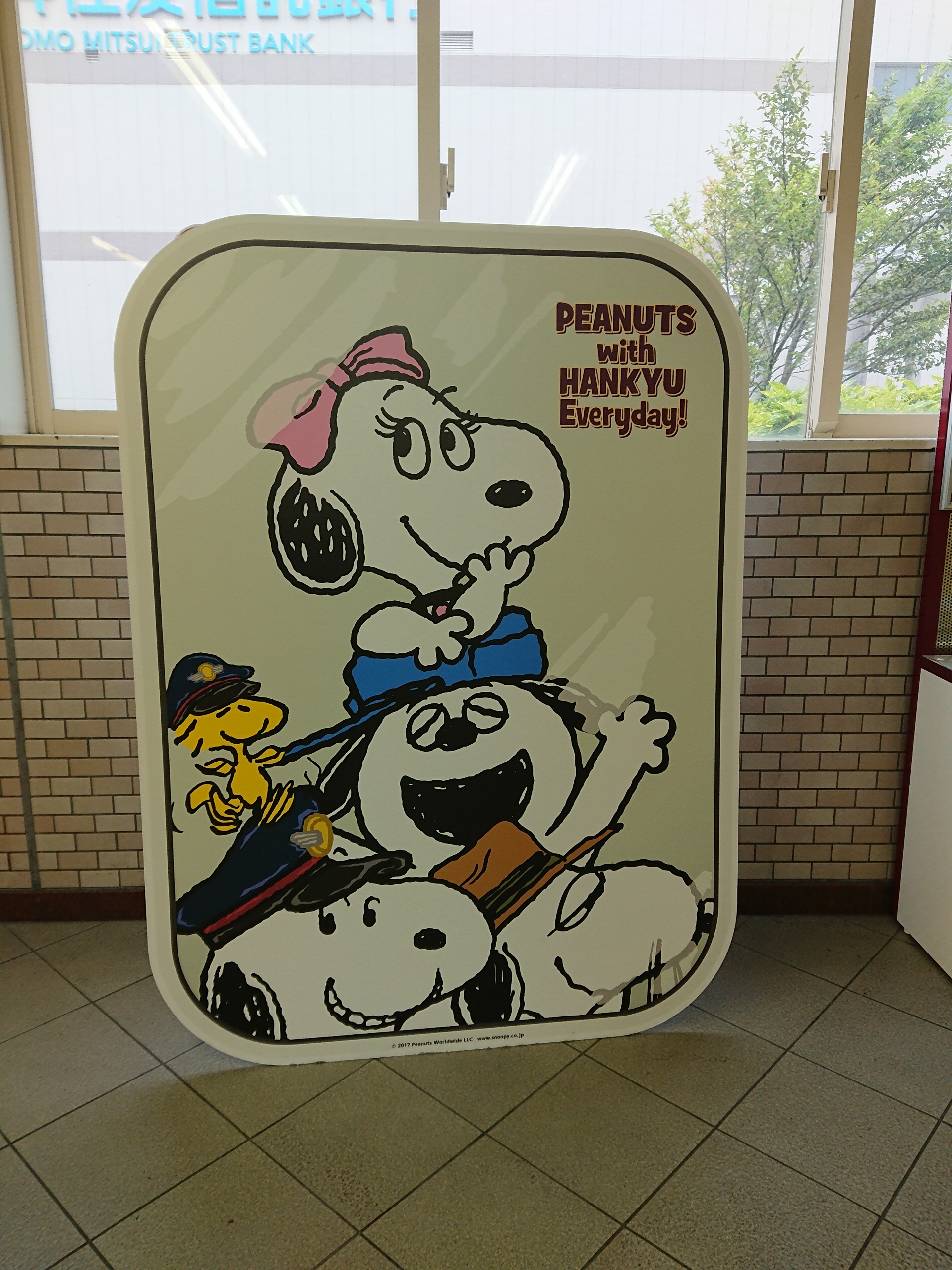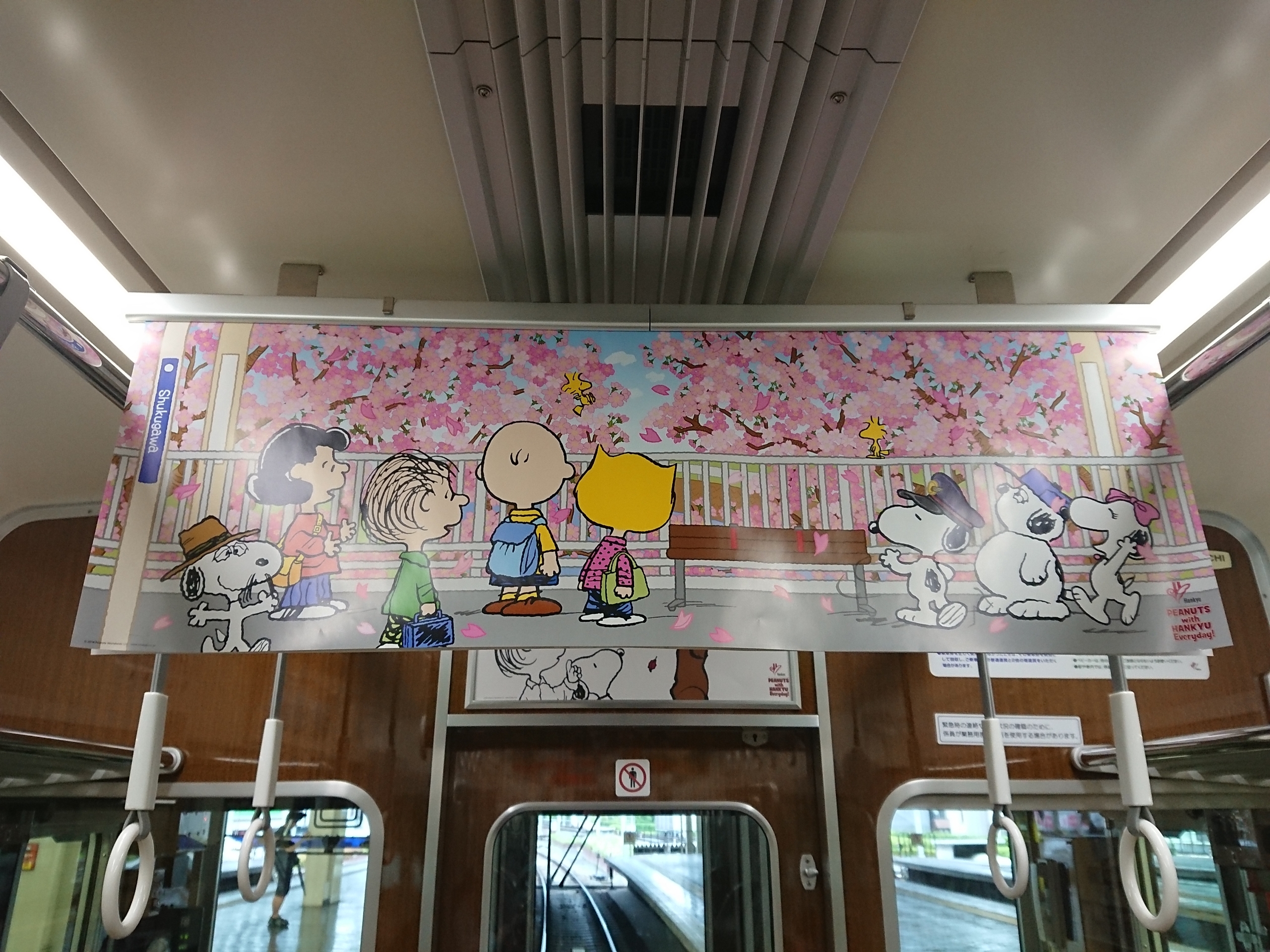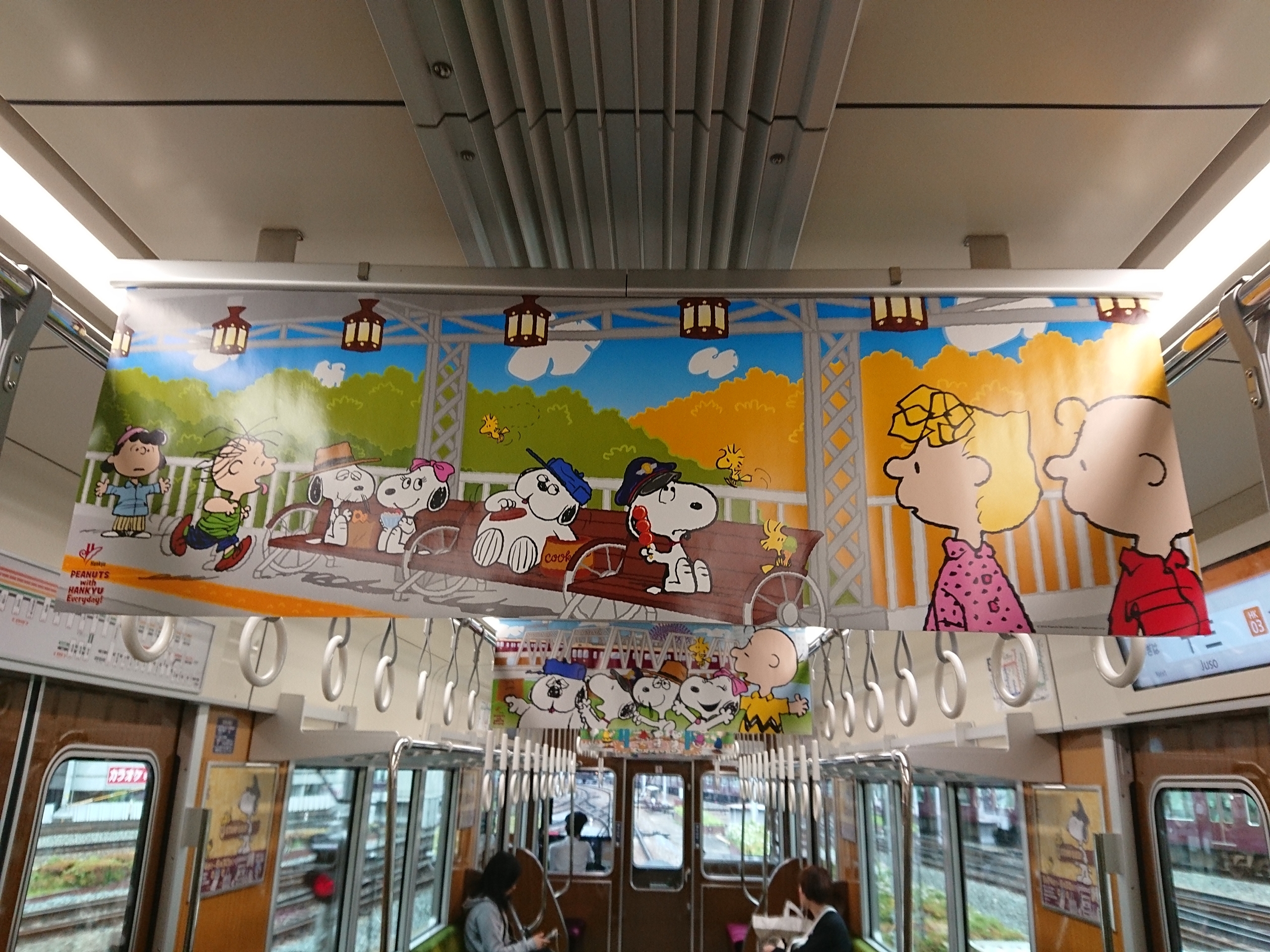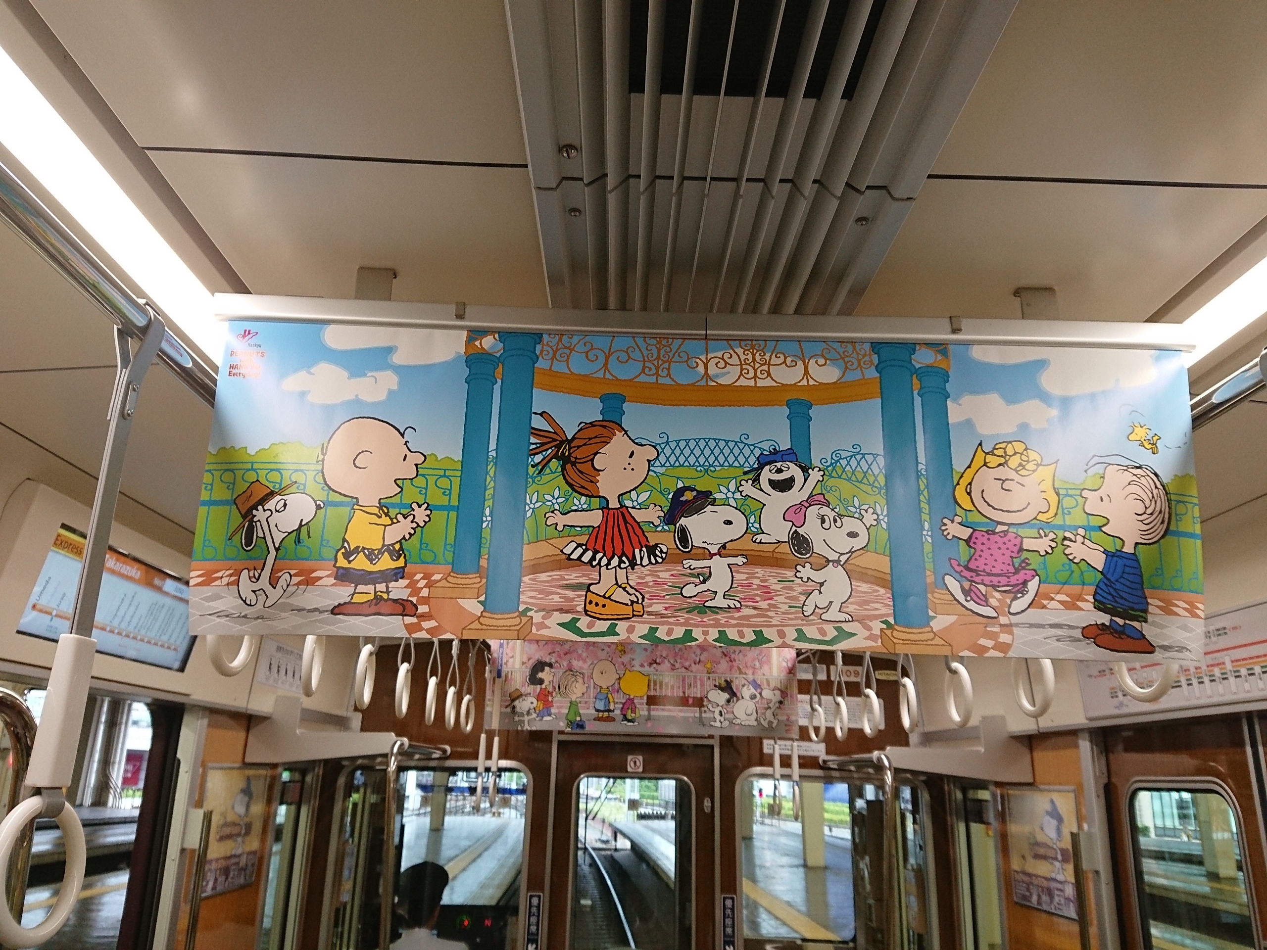 今回の装飾では、阪急沿線にPEANUTSキャラクターが出かけるという設定のデザインが施されています。