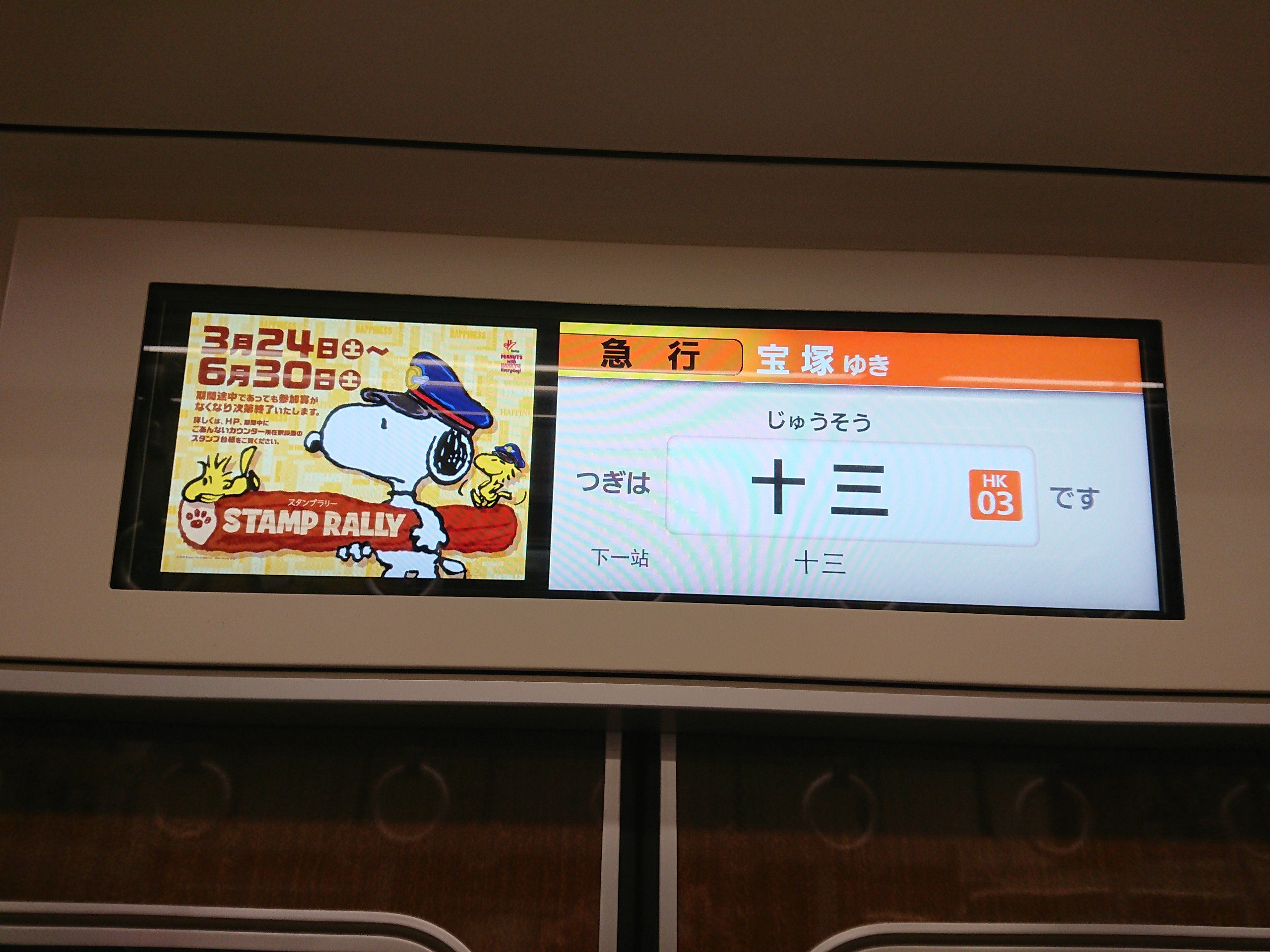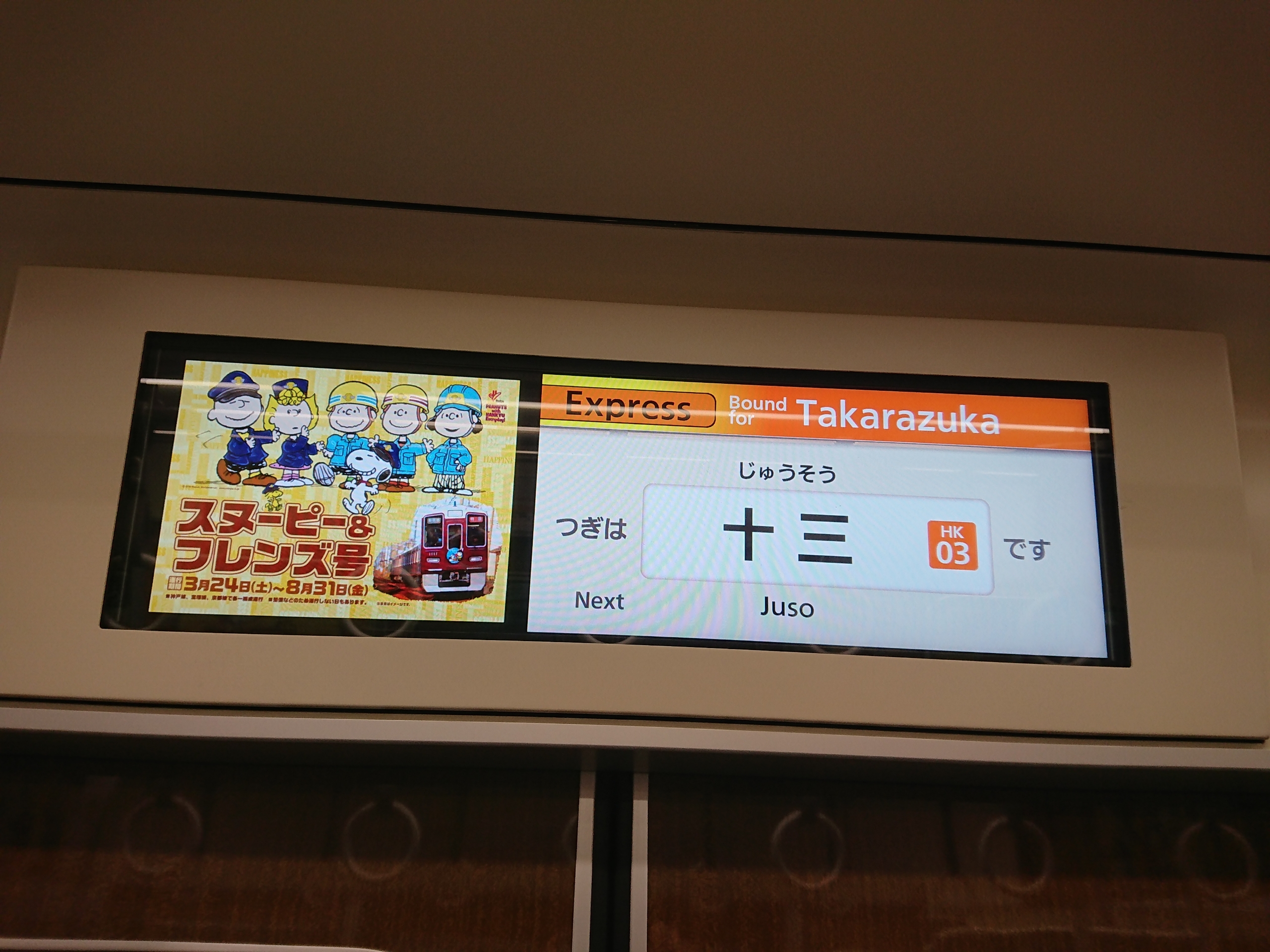 この3月から実施された第2弾、恐らく撮影する機会はないのでは、と思っていたら、たまたま阪急宝塚線に乗車する機会があり、それならあわよくばこの「スヌーピー&フレンズ号」に遭遇できればな、と思っていたら、これまたラッキーにも当該編成が急行宝塚行きとして入線してきました。