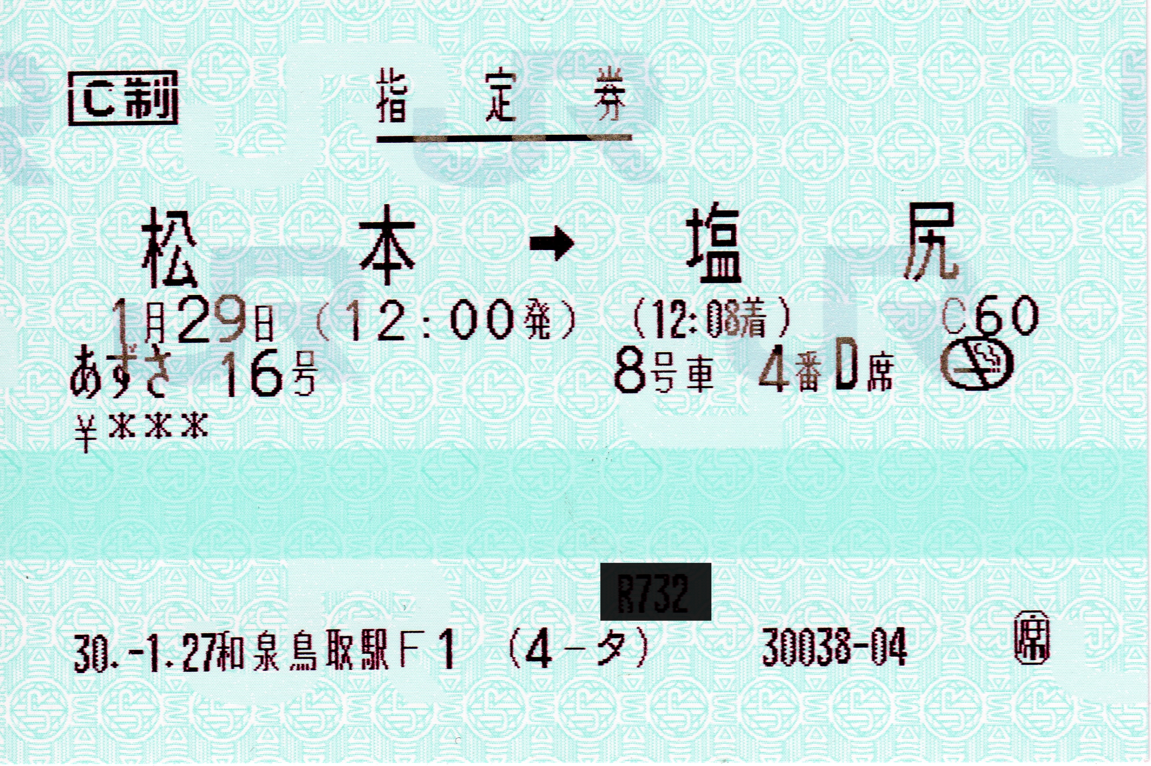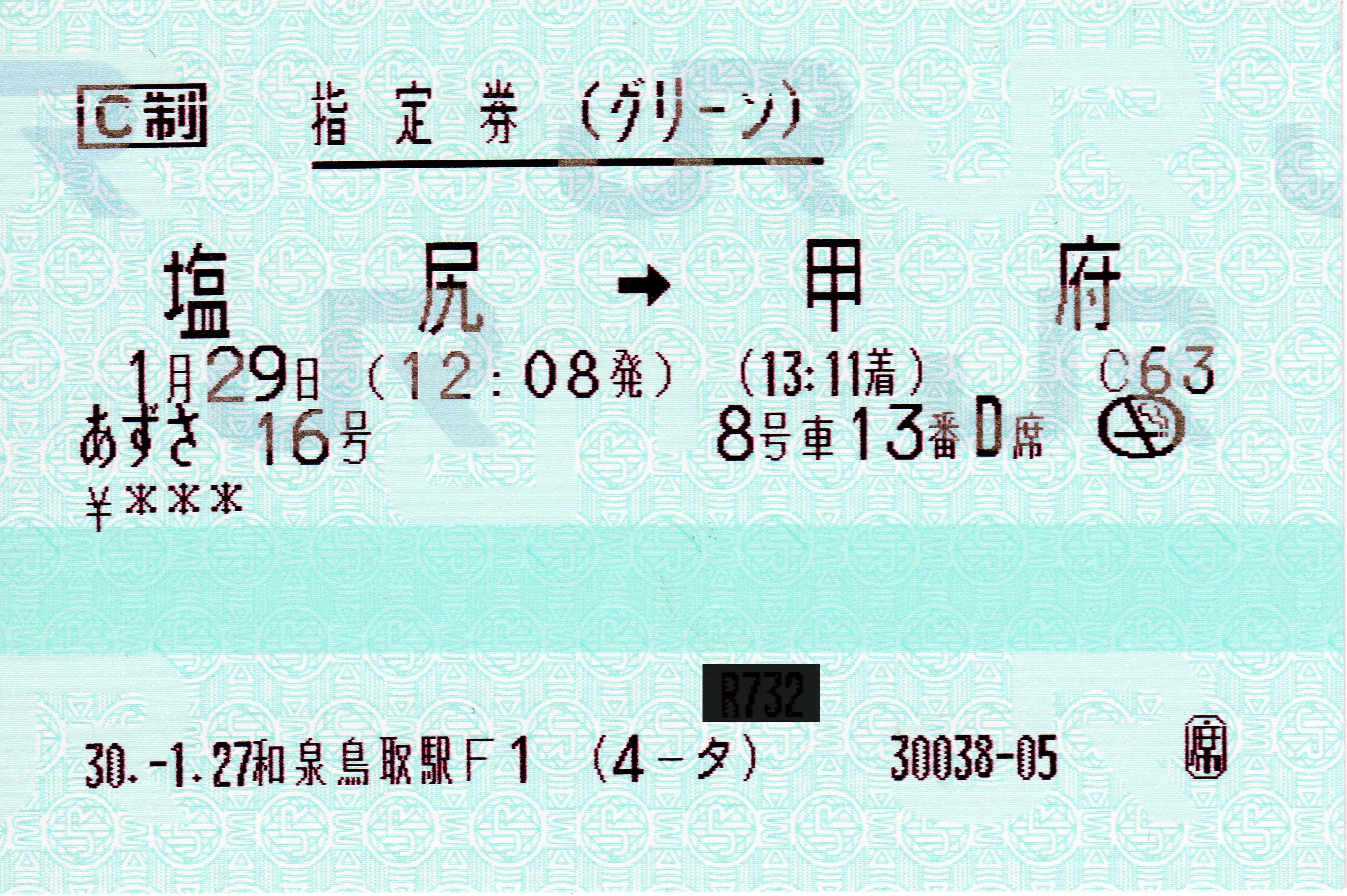 この例では、松本→甲府の特急「あずさ16号」を、松本→塩尻は普通車指定席、塩尻→甲府はグリーン席を利用するもので、同じ列車で一部区間でグリーン席を使用する際に発券されたものです。