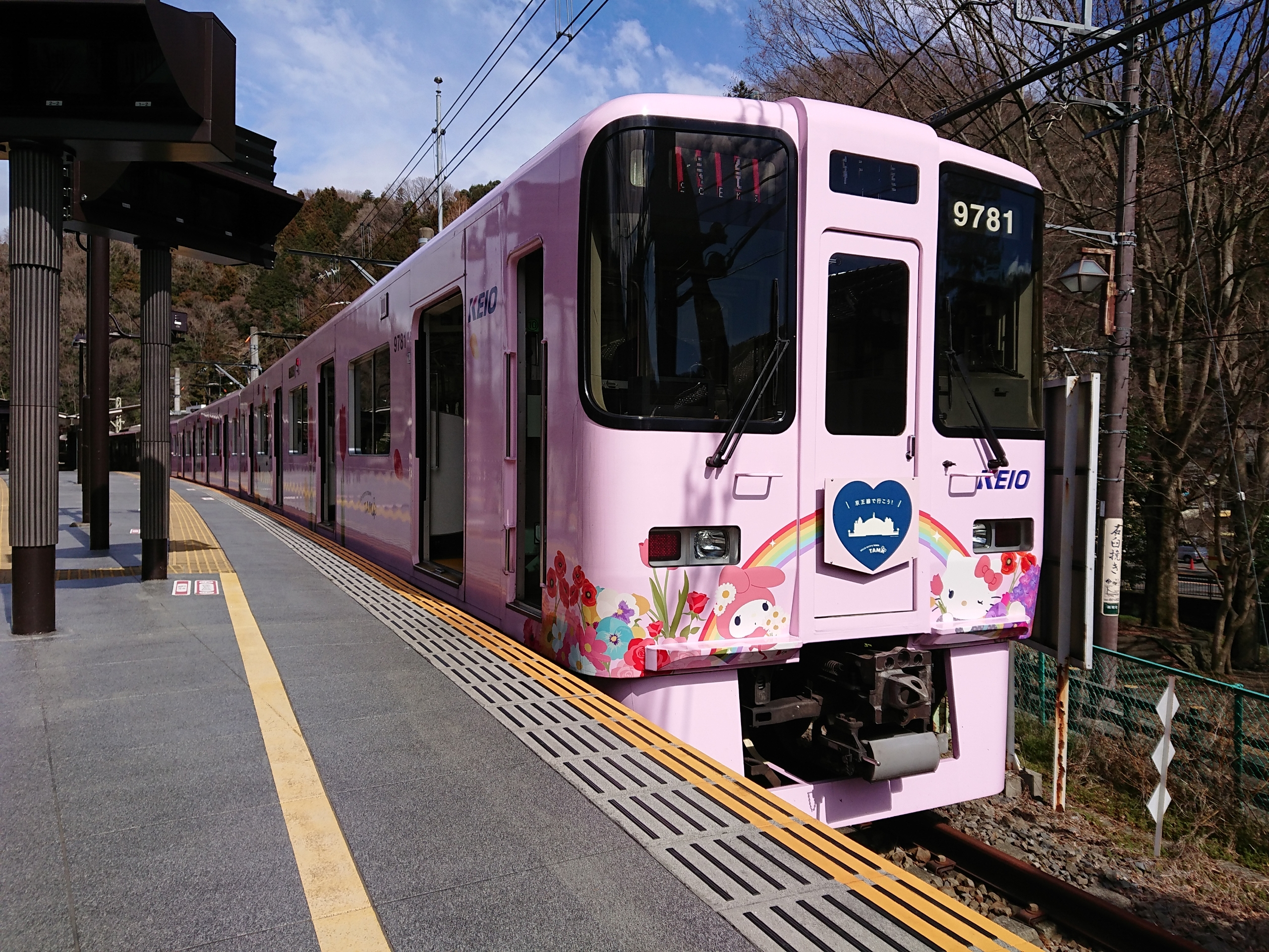 町田・八王子・高尾と乗り継いで、高尾山口に到着すると、何やらハローキティやらサンリオのキャラクターが描かれた編成が停車していました。