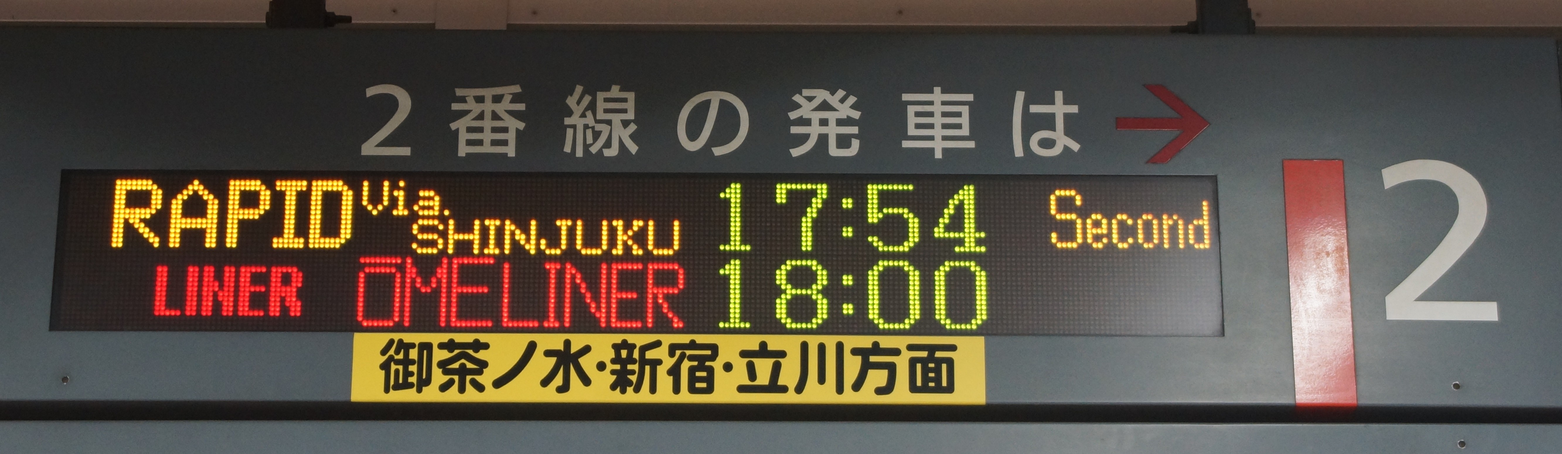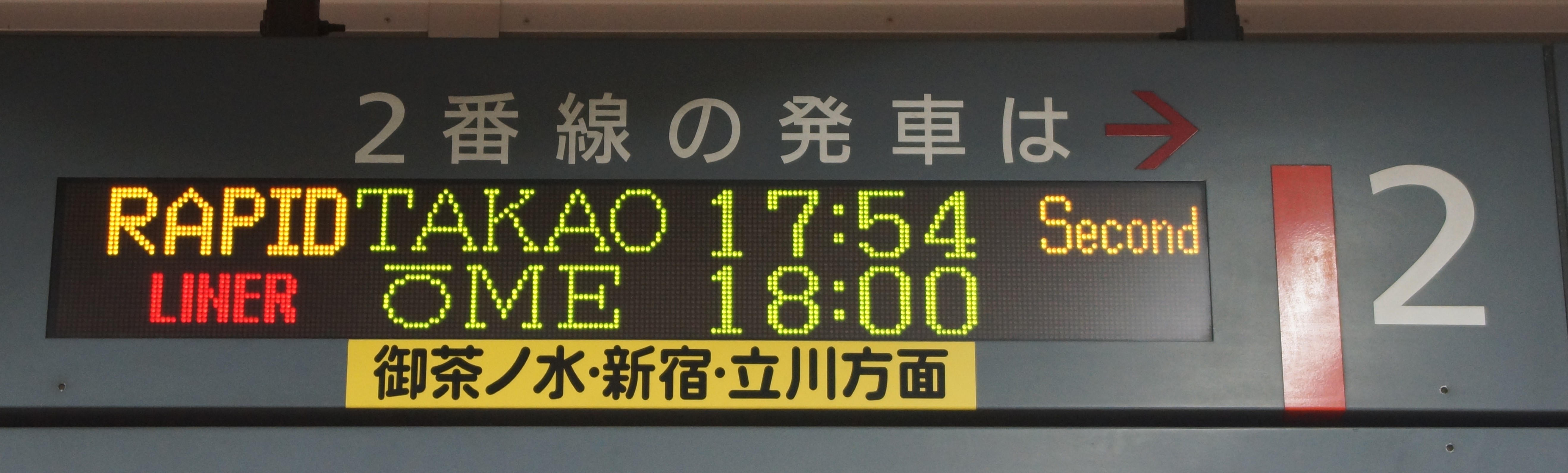 18時丁度に東京を出た後、新宿に停車し、その後は立川・拝島・河辺、そして終点青梅に停車します。