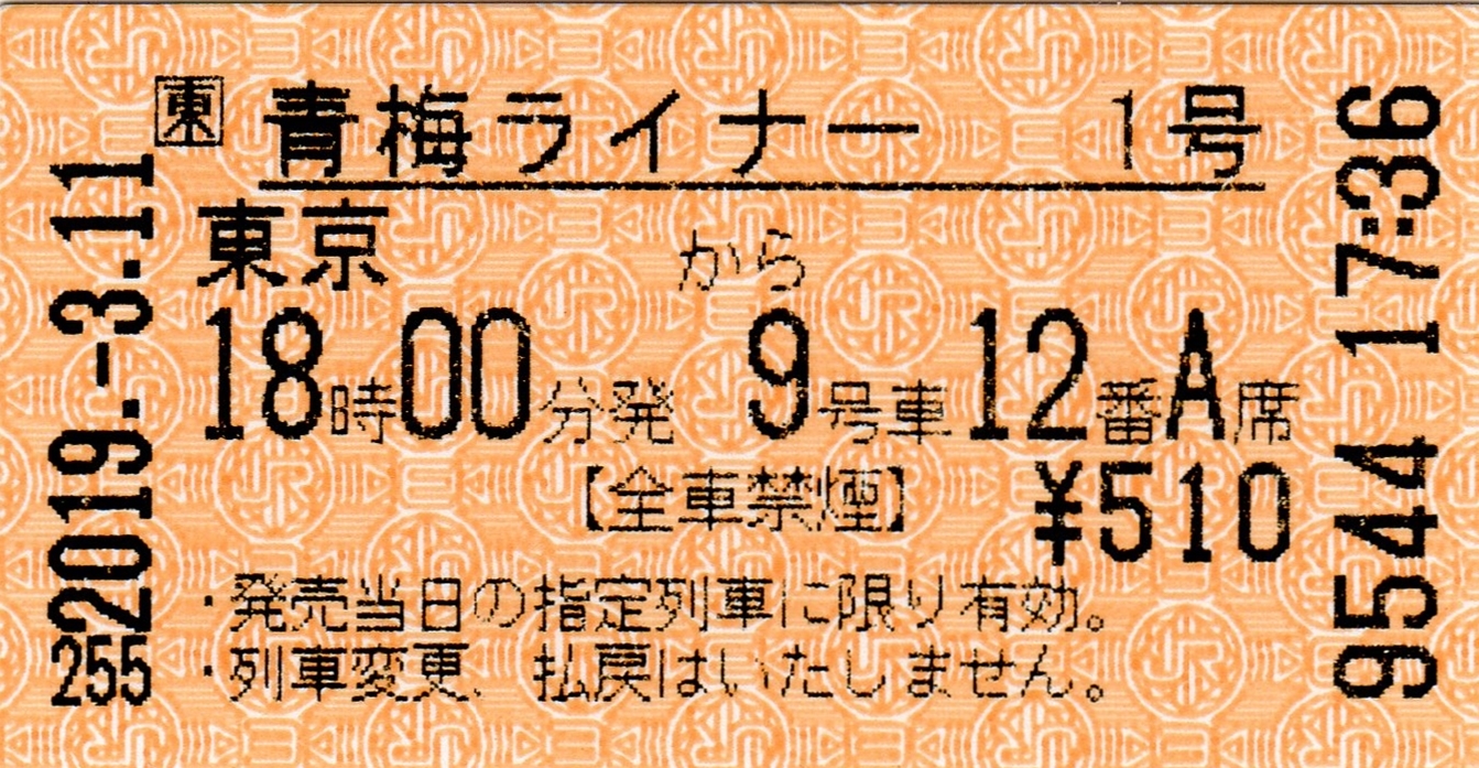 先ほどの自動券売機で入手した「青梅ライナー」ライナー券はこちらです。