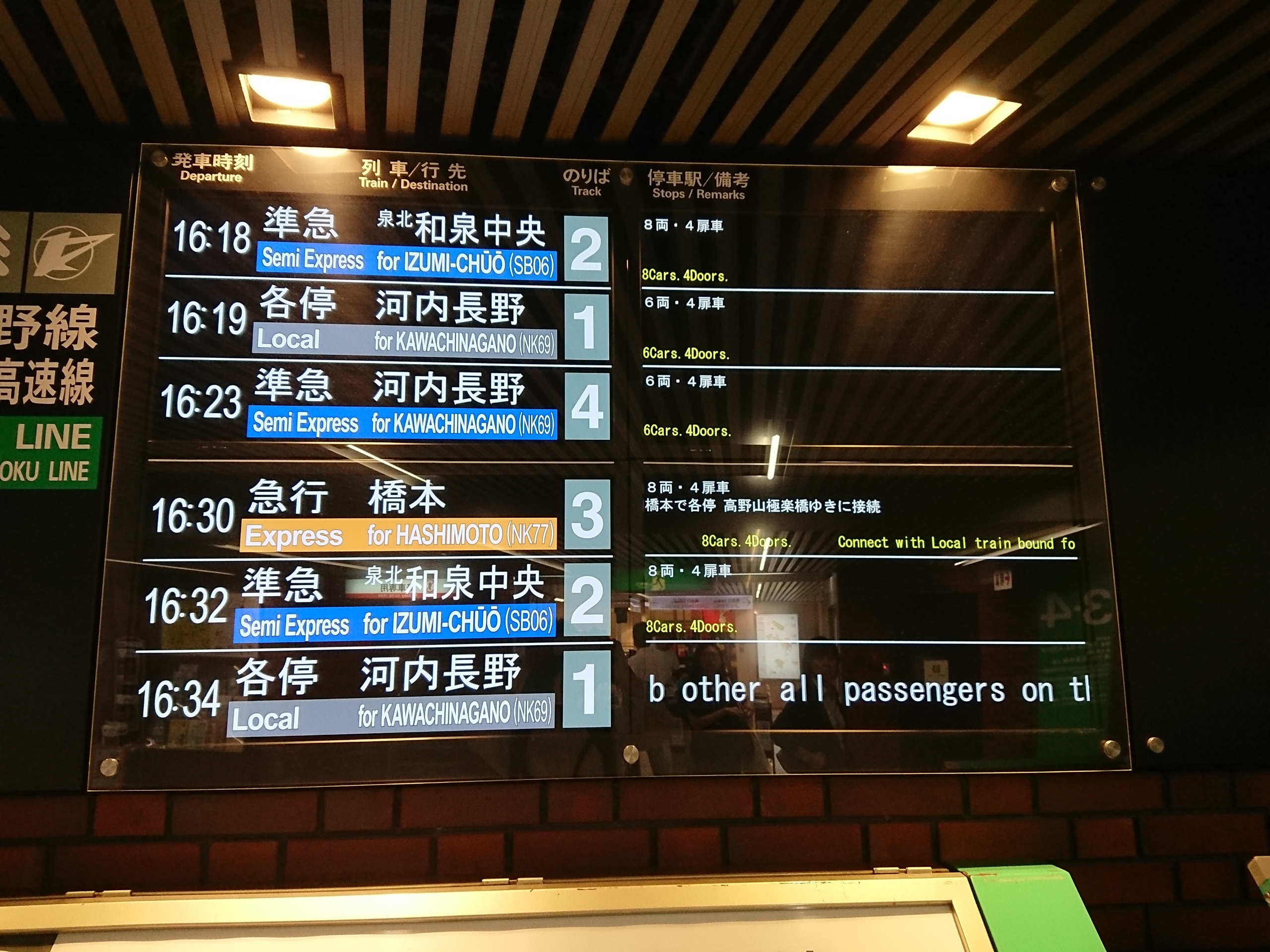 高野線の下り(難波発)の準急列車は、現在、平日ダイヤの23時40分発三日市町行きの準急が設定されているのみで、勿論河内長野行きが表示されるのも、本日限りであります。