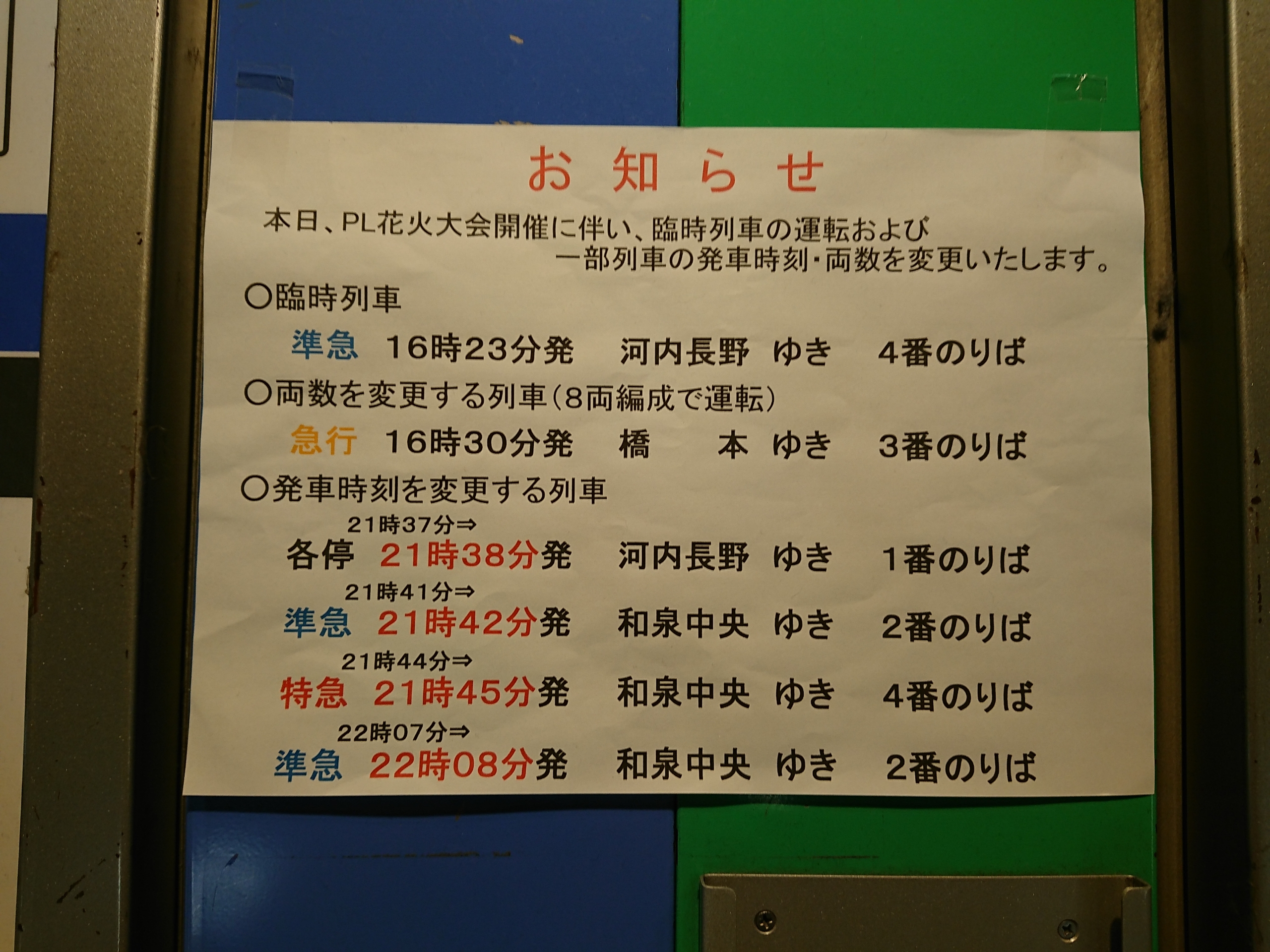 ともあれ、一年に一度見られるレアな光景でありますが、来年のPL花火の際にはどんな臨時列車が見られるのか、機会があれば記録できればと思っています。