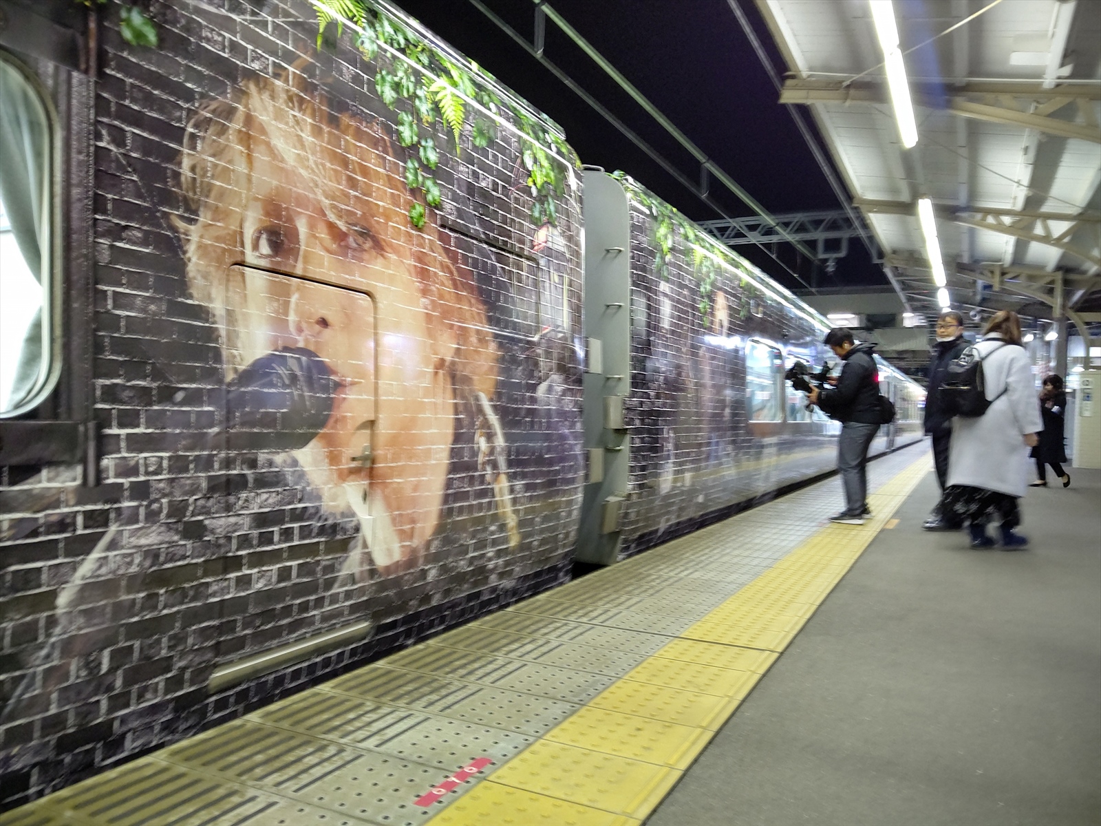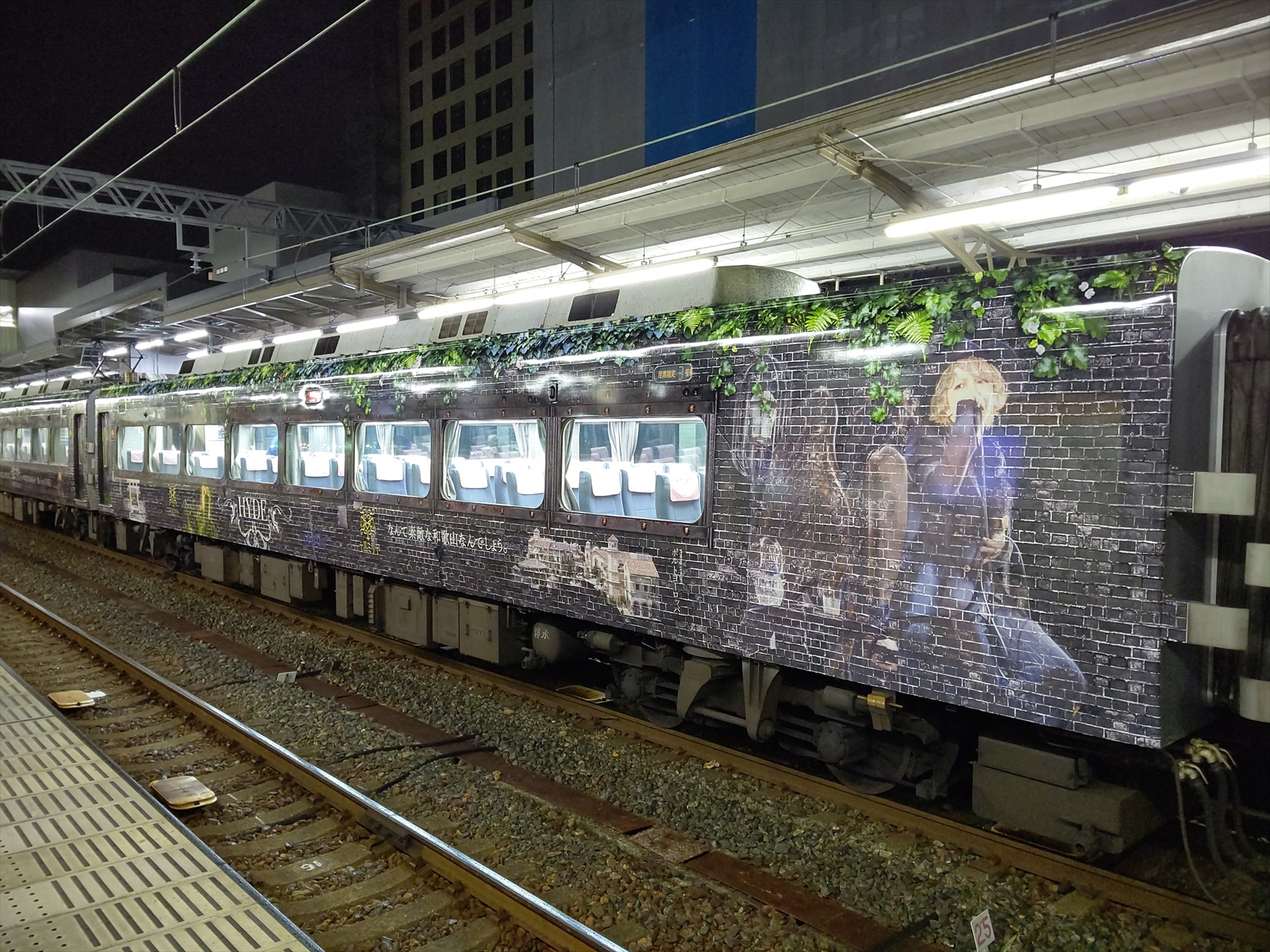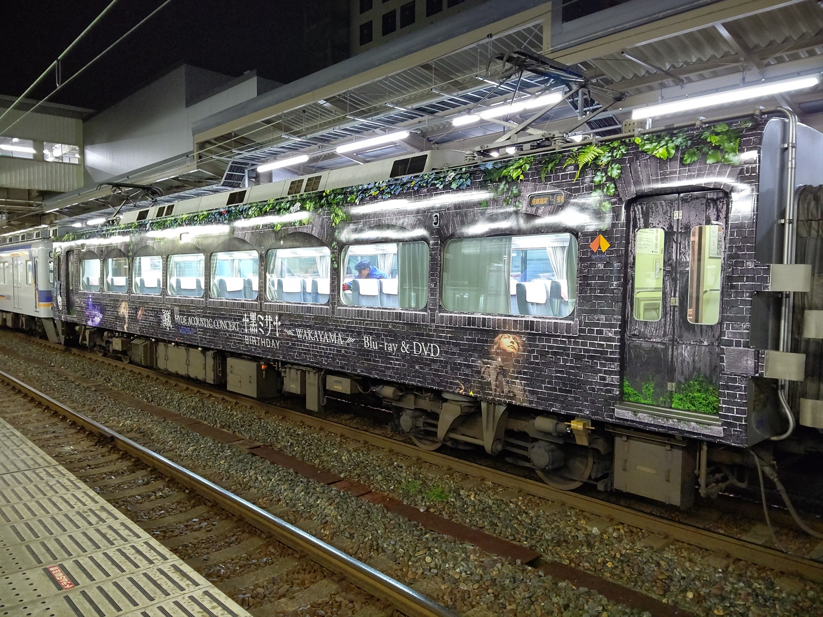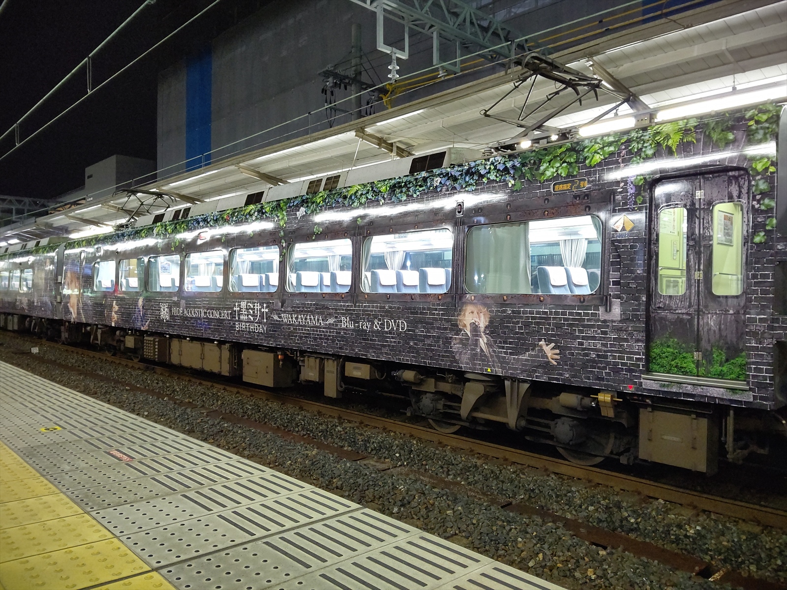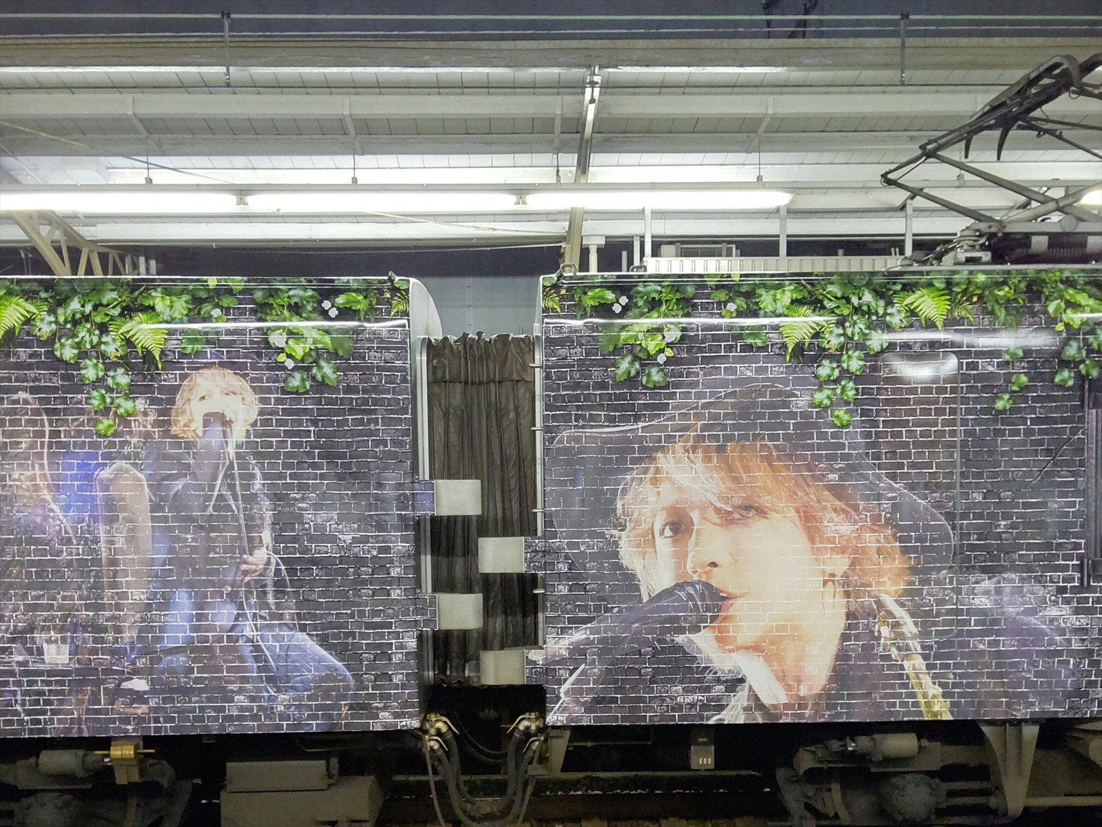 2号車と3号車の間には、サービスコーナー(自動販売機等)が設置されているため、この部分には窓がありませんが、そのスペースを利用して、HYDEさんの顔が大きく描かれており、ファンにとっては見逃せない撮影ポイントといえるでしょう。