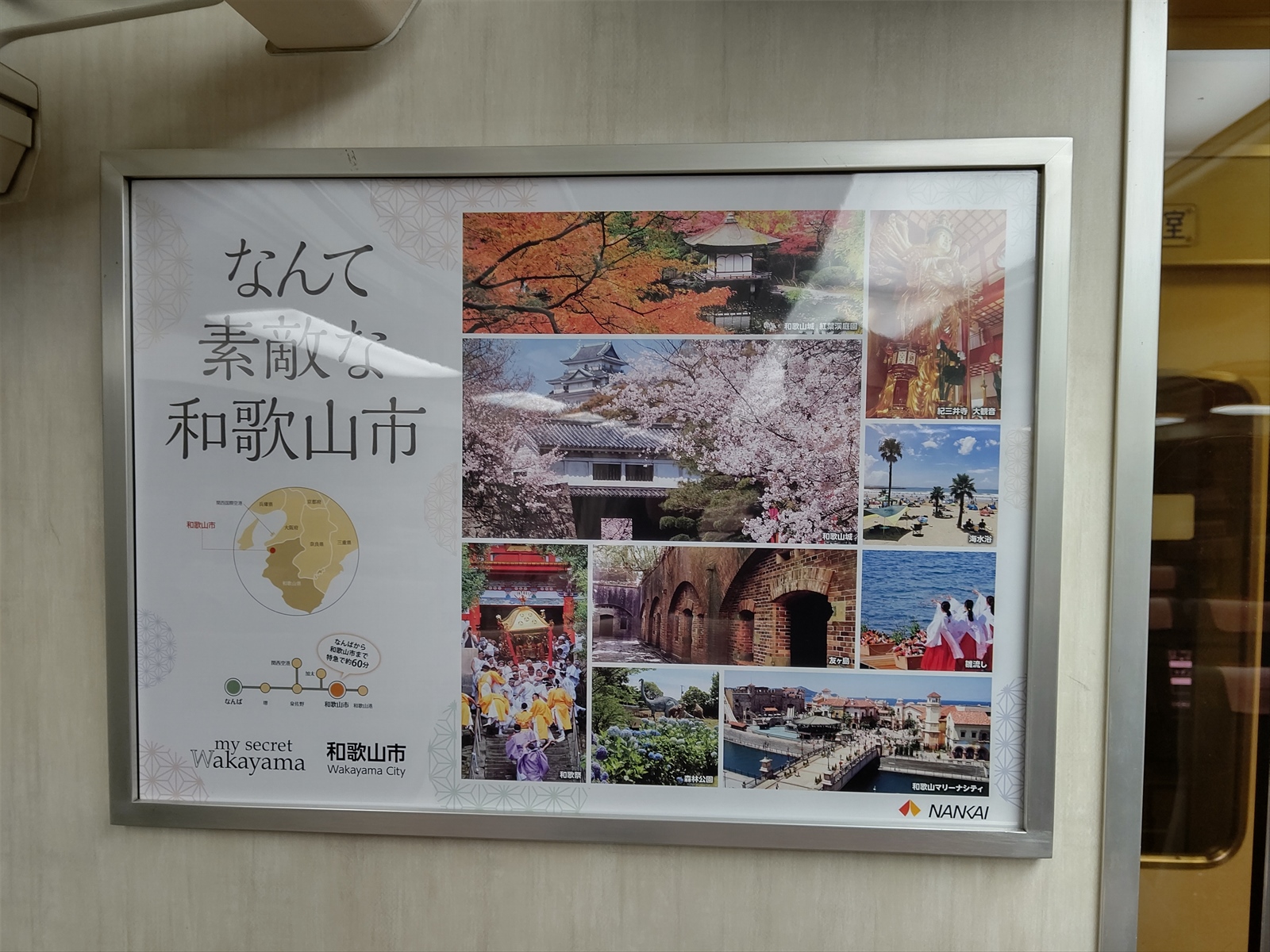 客室内の扉付近にある広告枠は、全て「なんて素敵な和歌山市」と記された和歌山市の広告となっていました。