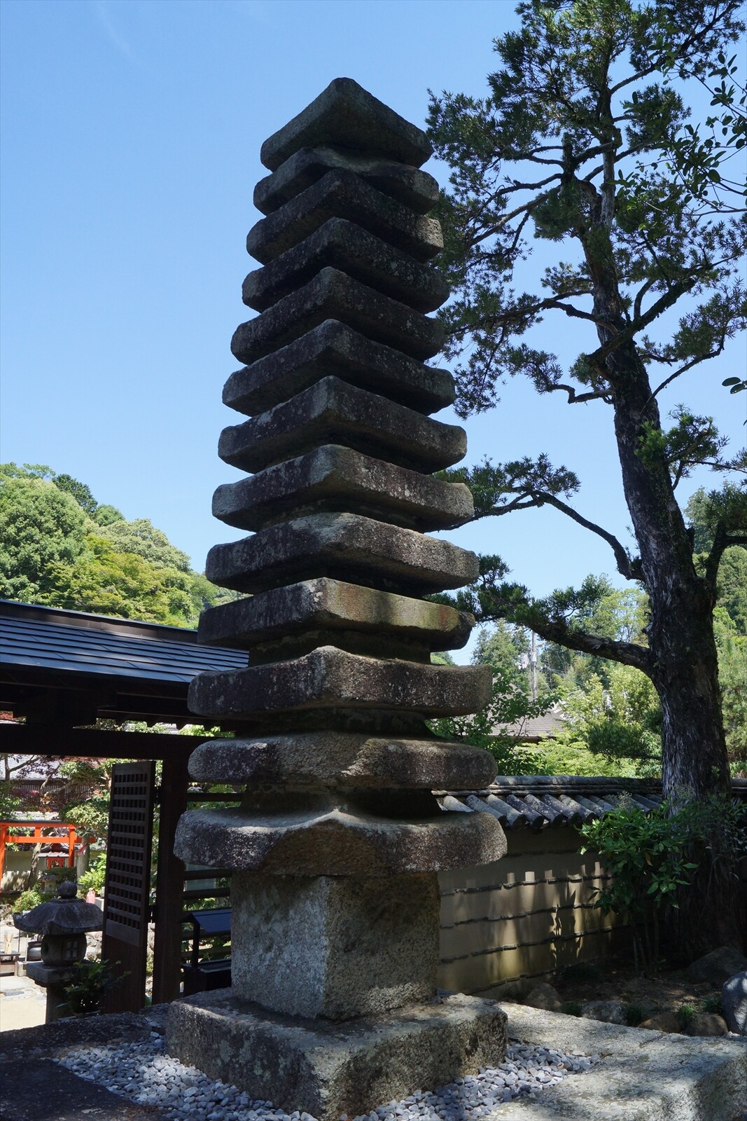 ▲本堂の左手奥にある十三重石塔。