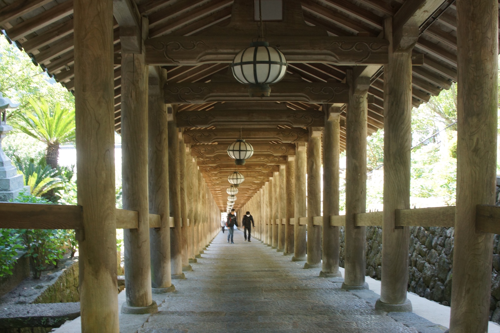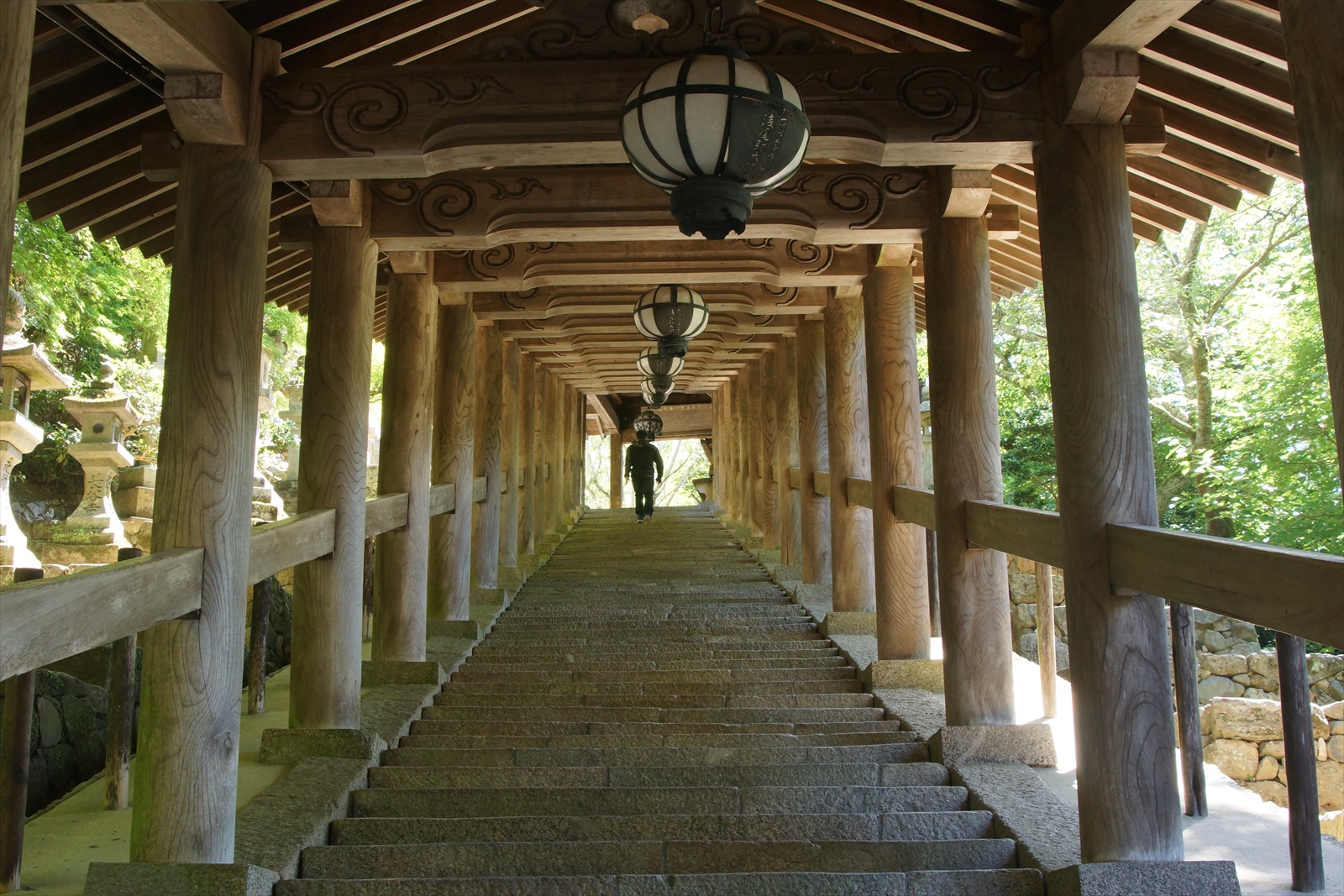 総計399段の登廊は、途中上・中・下の三廊に分かれており、その様子は上記の画像のように、どこまでこの先続くのか、まさに遠近法の世界、といった廊下が続いています。