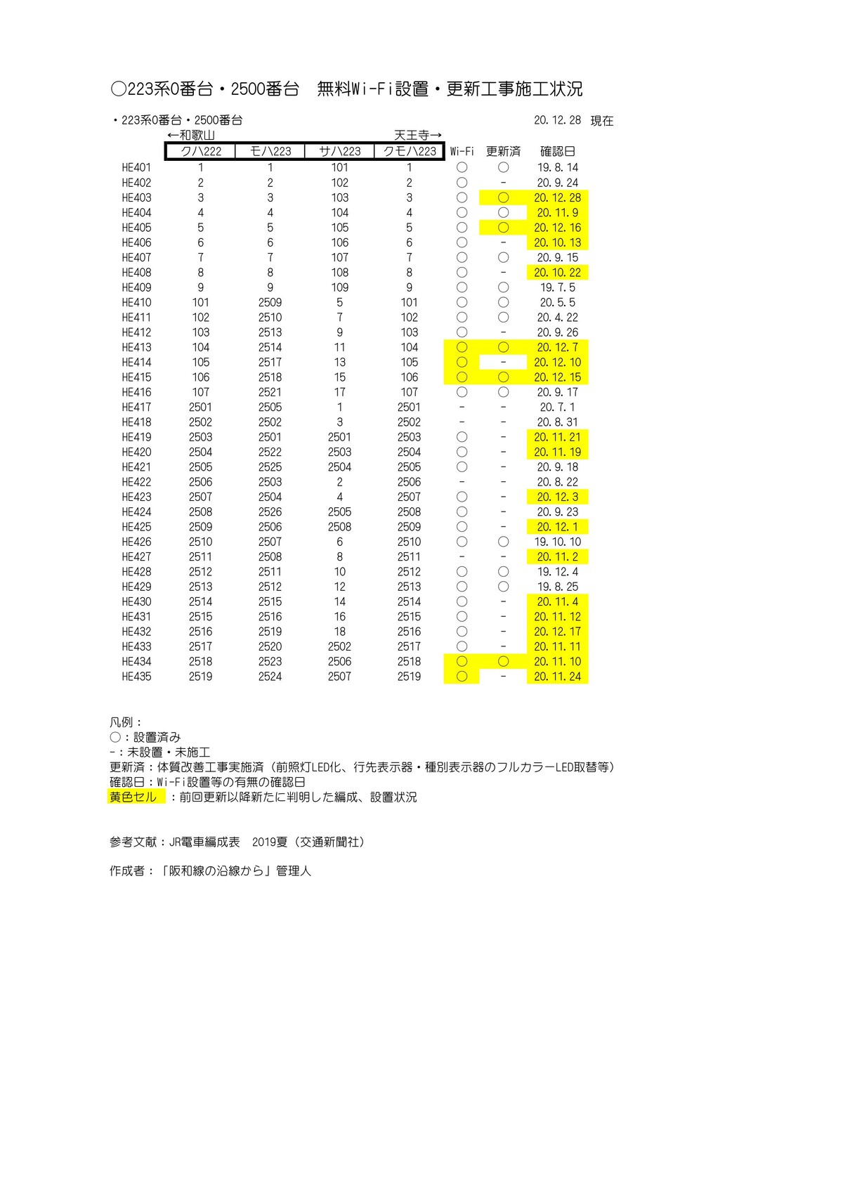 阪和線の223系0番台・2500番台の編成表および車内Wi-Fi設置状況について、本日(2020年12月28日)現在の状況をアップしましたので、ご活用下さい。