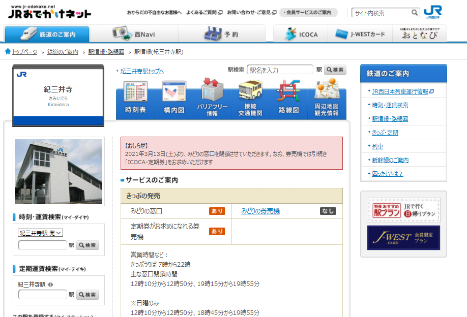 ところで、今回「みどりの窓口」が閉鎖されるのは、和泉鳥取、六十谷の両駅だけでなく、私が確認できただけでも、紀三井寺、黒江駅でも窓口でのきっぷ販売が終了となっています。