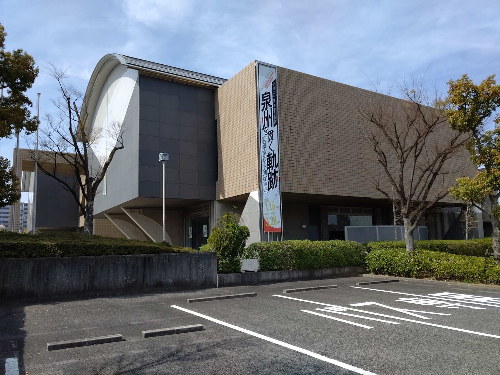 今回の企画展「泉州を貫く軌跡」の垂れ幕が、当時の阪和電鉄の広告を再現したデザインで描かれています。
