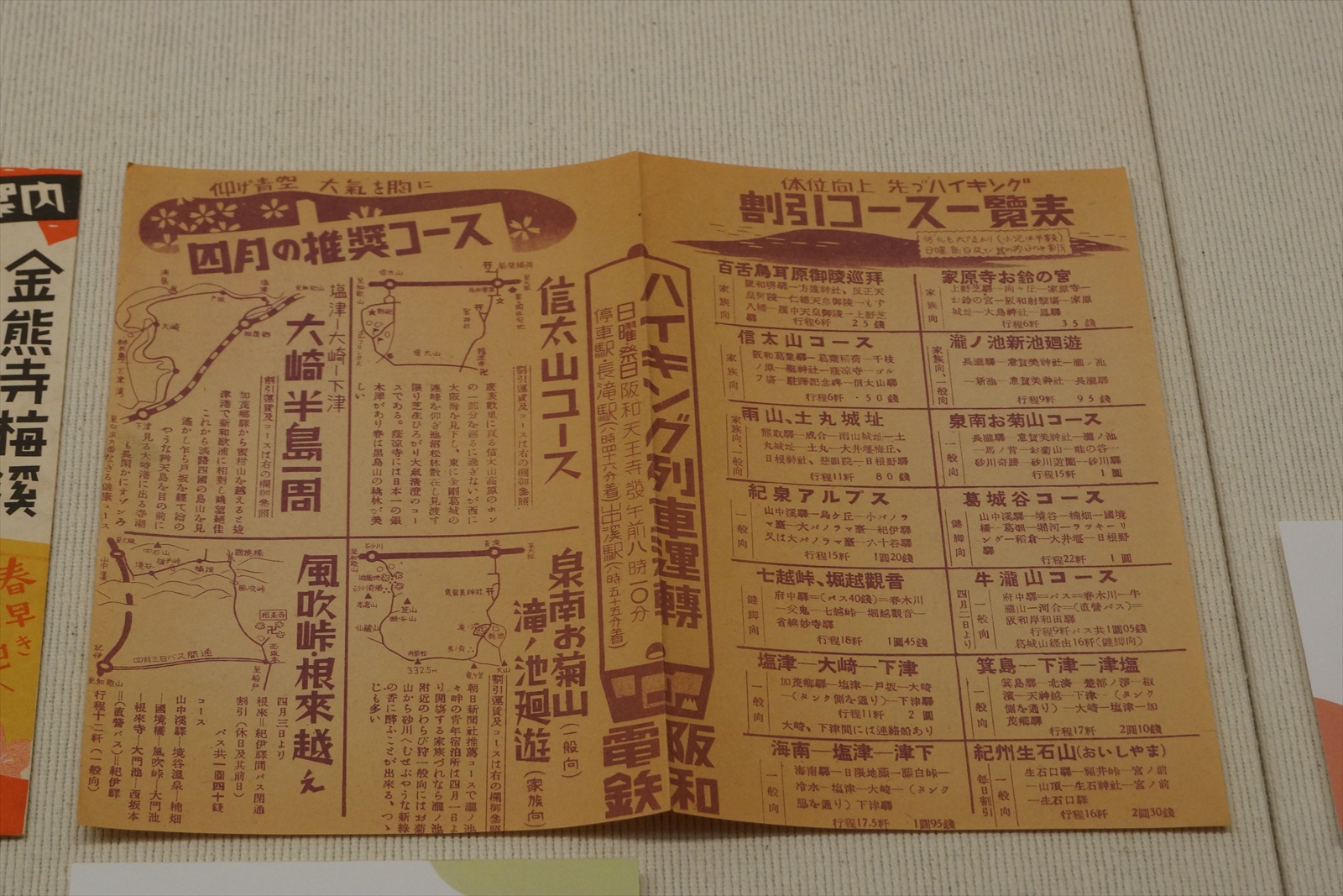 阪和沿線のハイキングコースとしては、山中渓から和泉山脈を越え紀伊に降りる、「紀泉アルプス」と称するコースなどをPRしていましたが、その紀泉アルプス等のハイキングのために、臨時列車も用意されていた模様です。