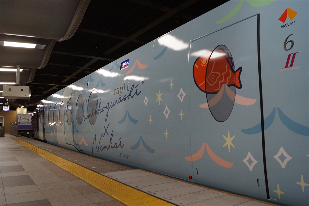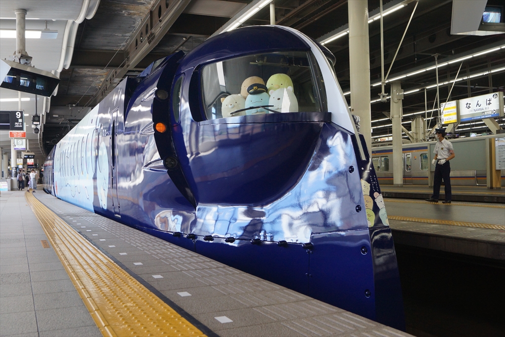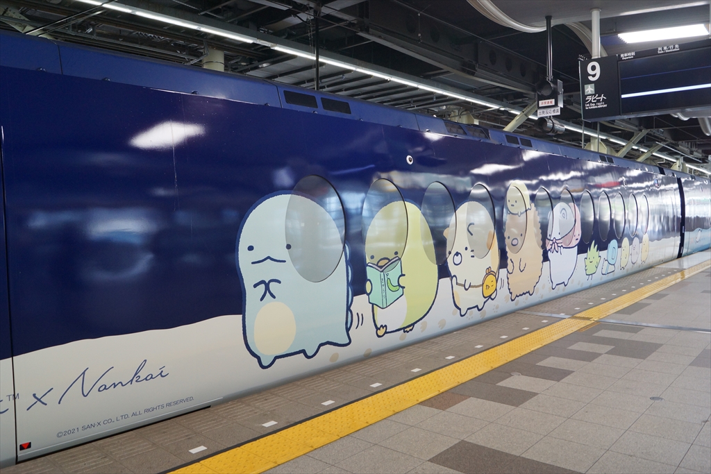 難波駅9番線に停車する「すみっコぐらし」ラピート。