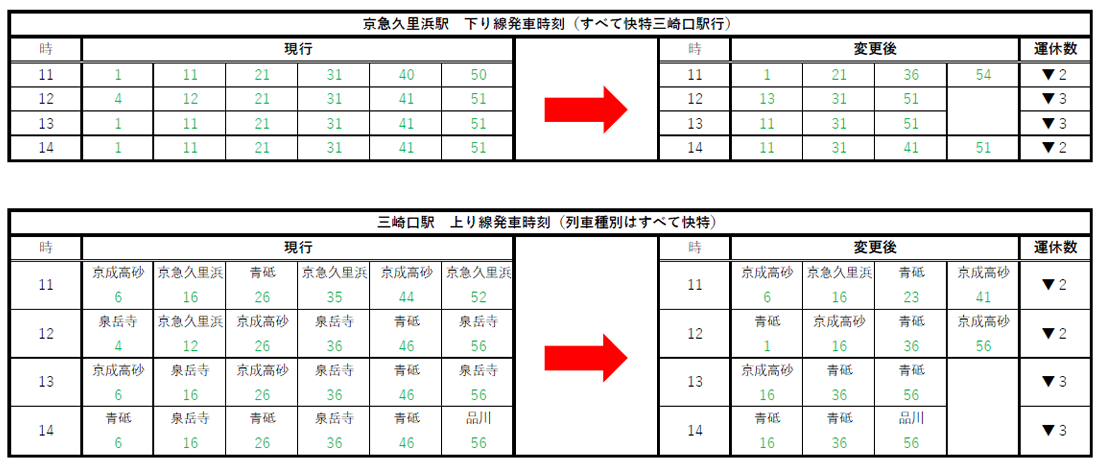 【変更前後の三崎口駅時刻表】
