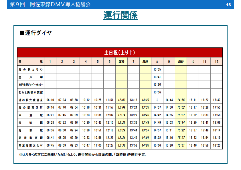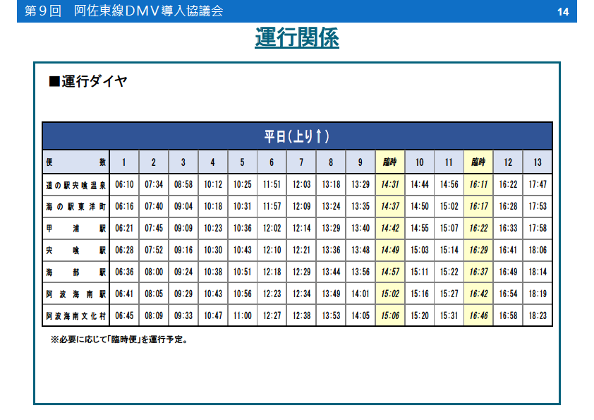 阿佐海岸鉄道のDMV運行内容については、令和3年11月10日の「第9回阿佐東線DMV導入協議会」の資料にまとまっていますので、こちらからご紹介したいと思います。