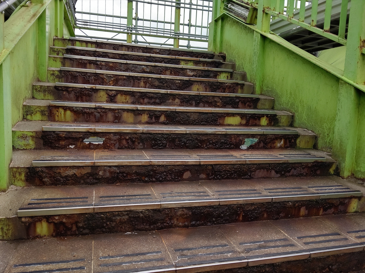 この跨線橋、以下の画像のように腐食して穴が開いているところありましたが、今回新しく改築されたことから、安全に利用ができるようになりました。