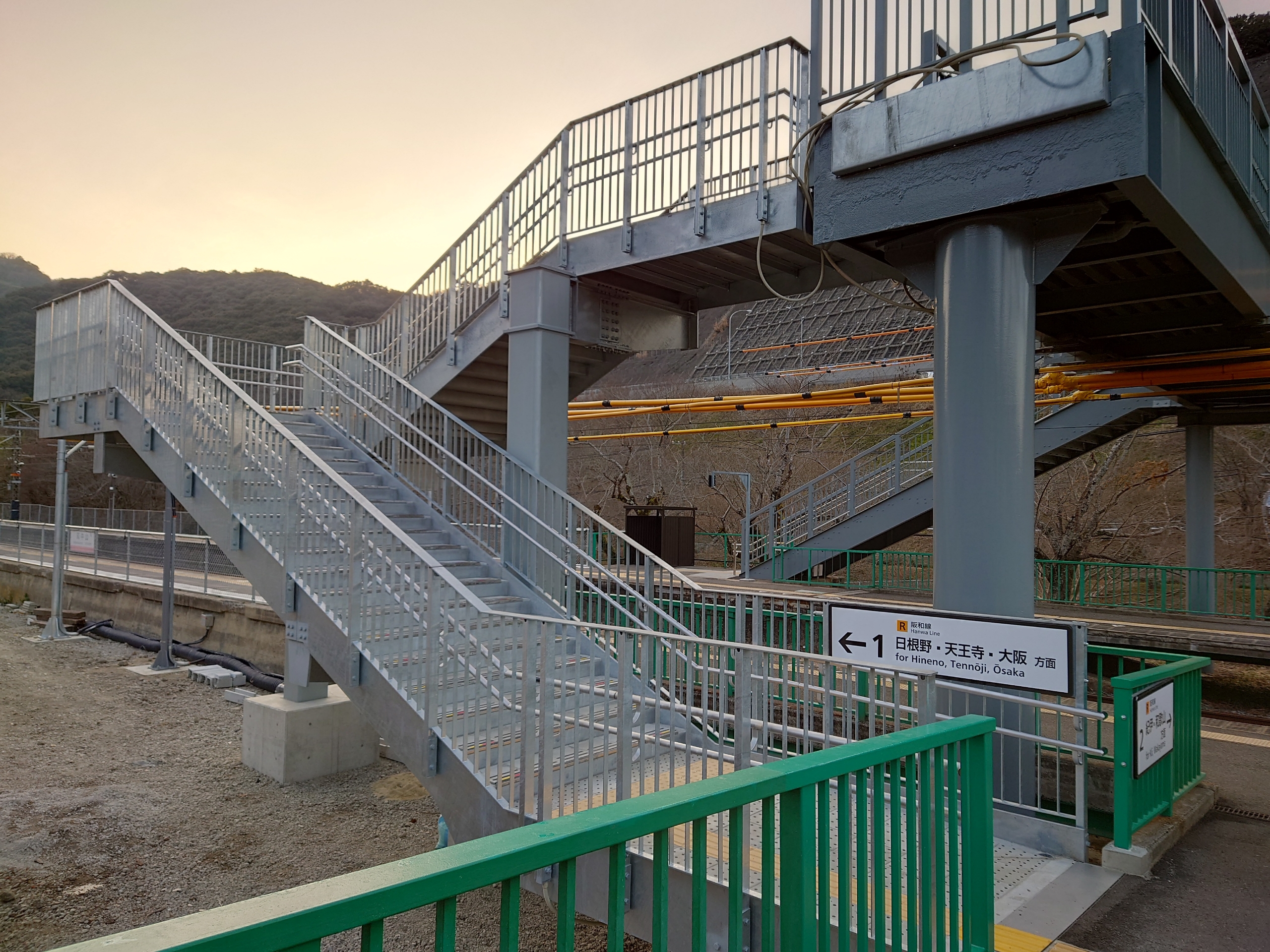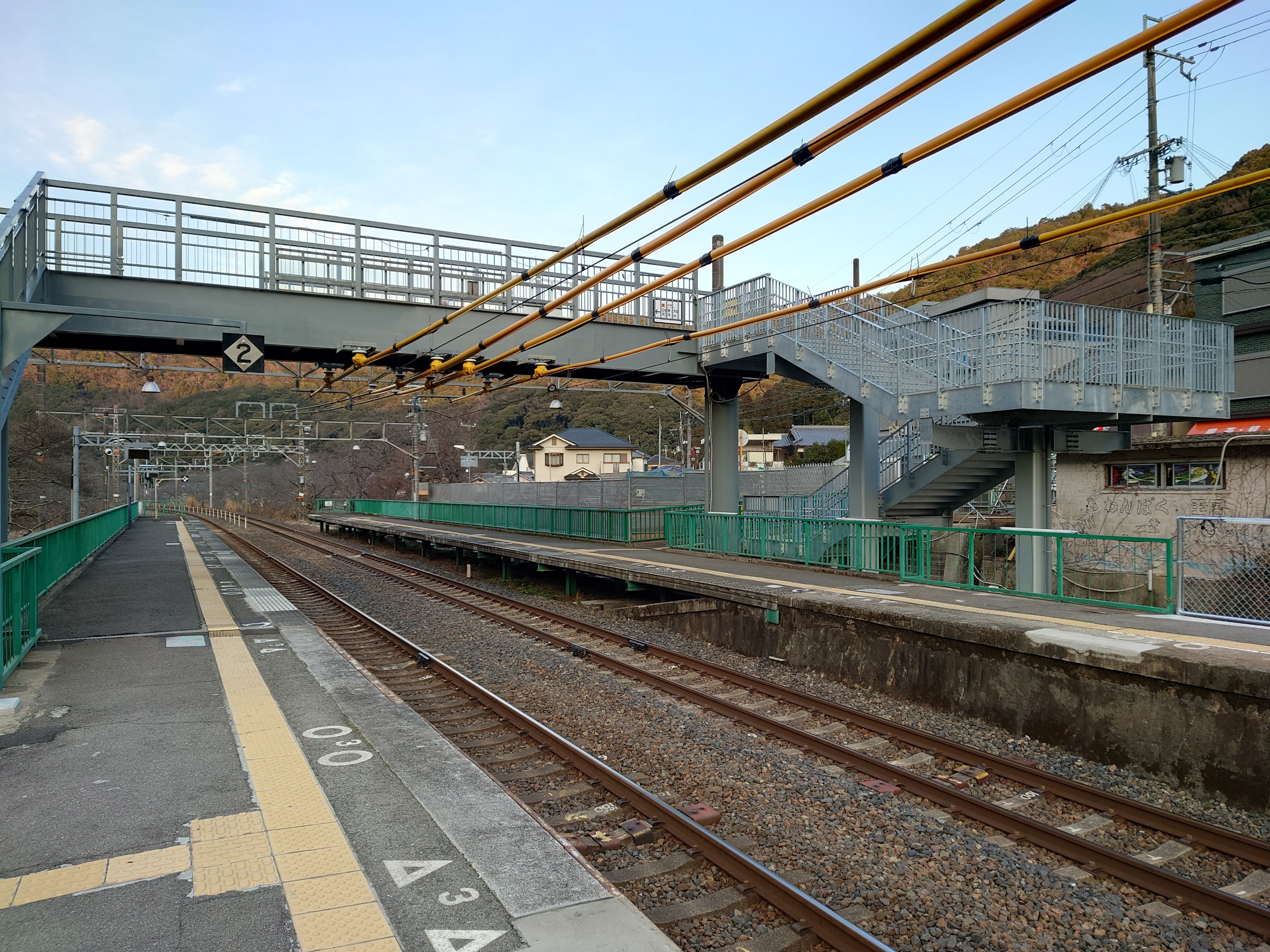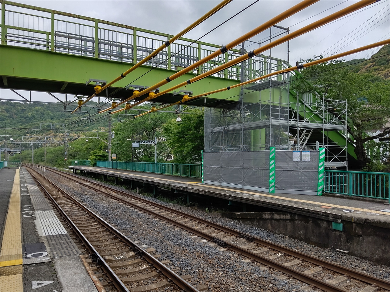 一方、上下ホームを結ぶ跨線橋は、塗装が塗り替えられるとともに、下りホーム側の階段が改築されていました。