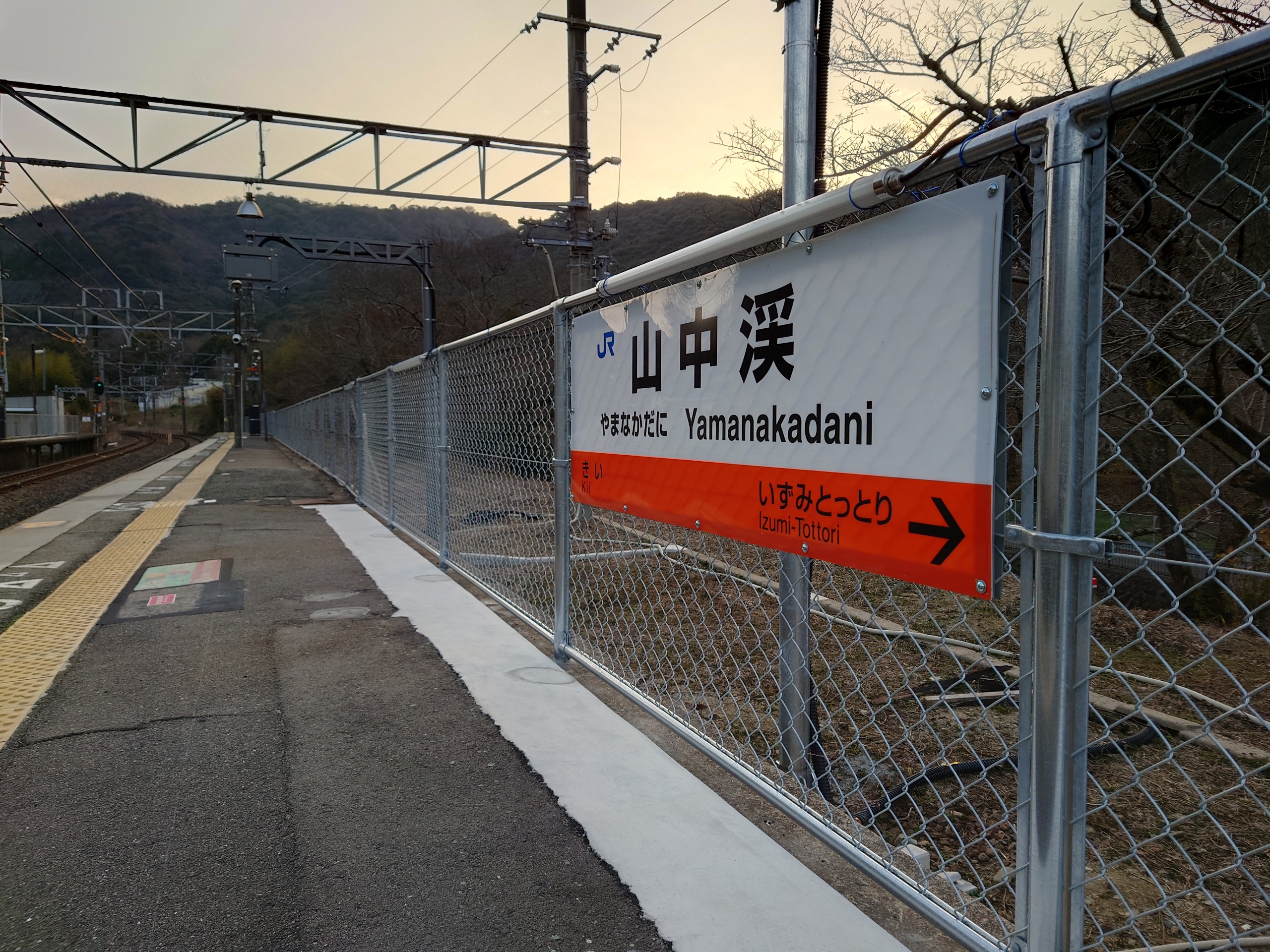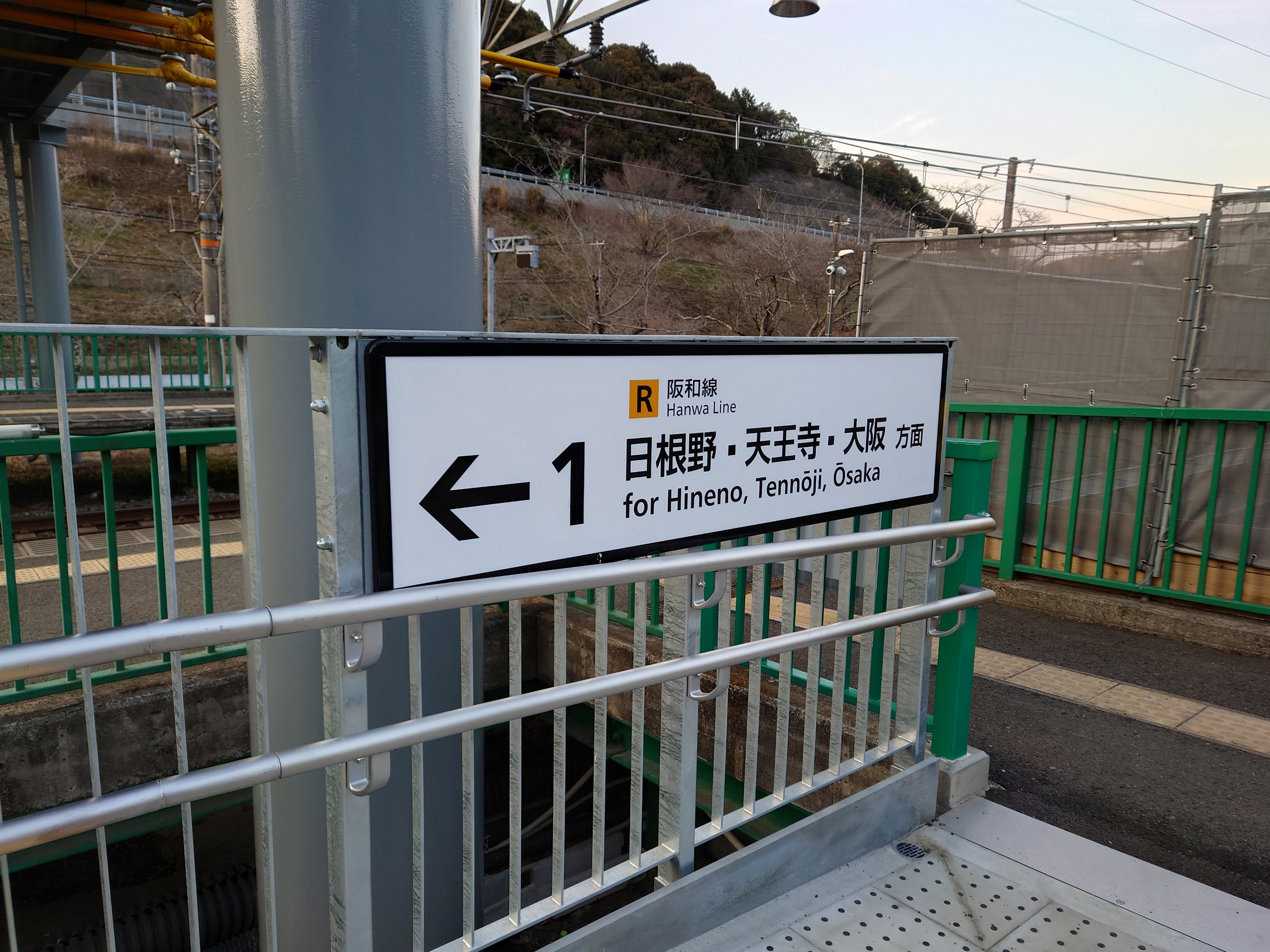 ▲ホーム屋根が撤去されているため、駅名標はフェンスに設置されています。