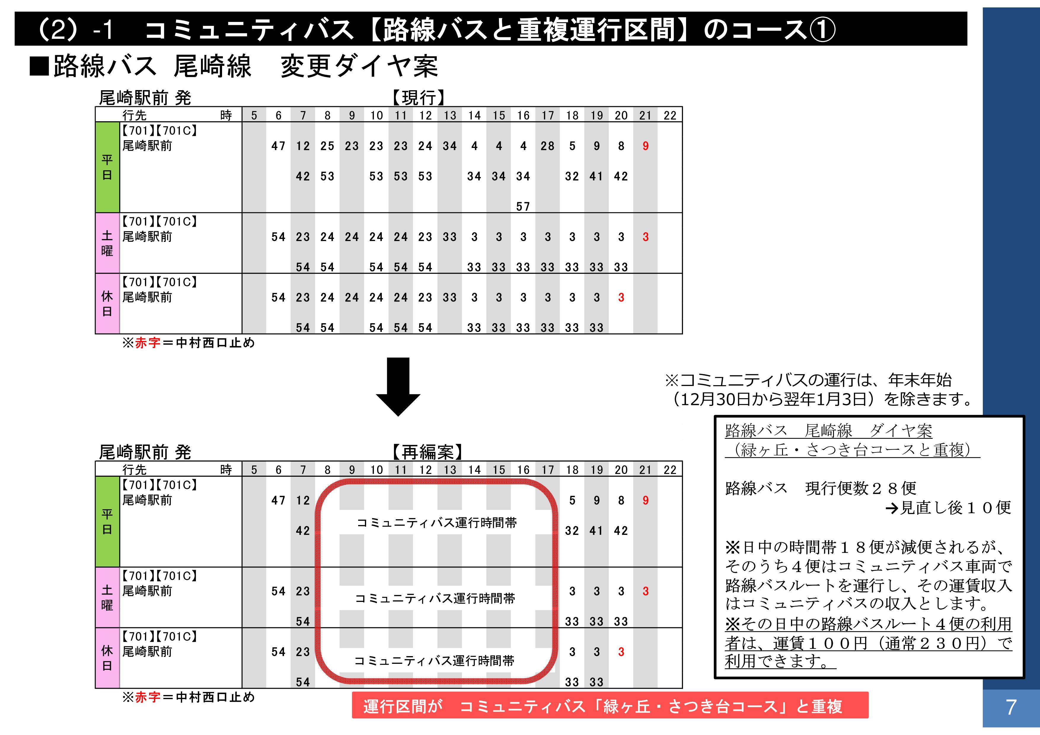 こちらも、上記の路線バス尾崎線と同様、6時台から22時台にかけて終日、1時間あたり1〜3本が運行されていますが、これを朝6時〜9時台・夕方17時台〜22時台の運行とし、10時〜16時台はコミュニティバスによる運行とします。