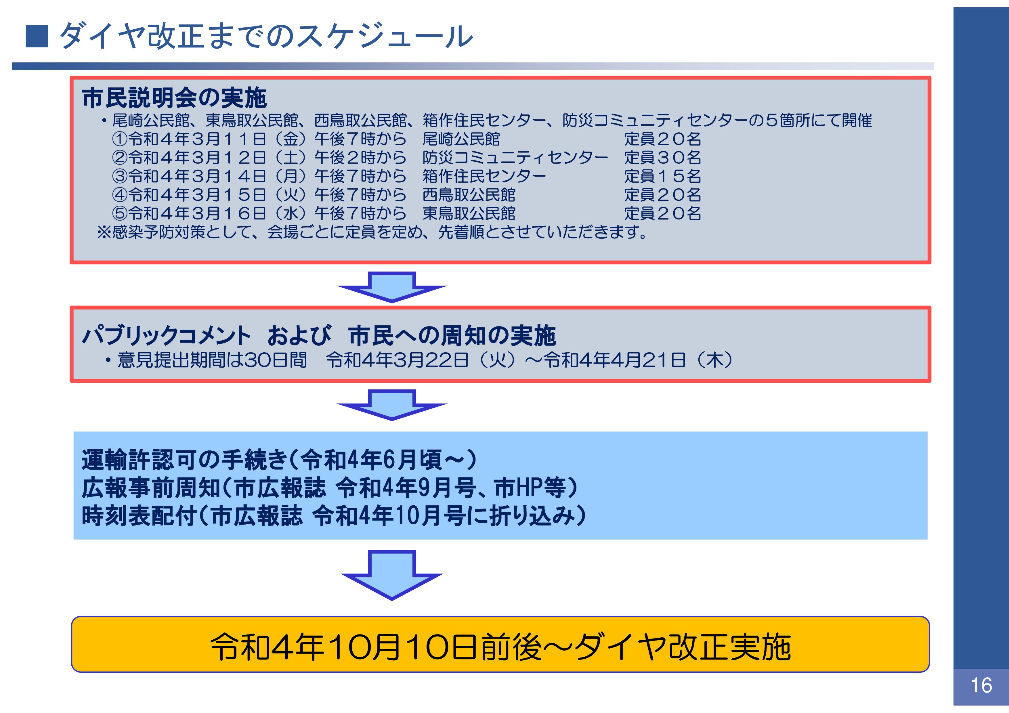 これによりますと、冒頭に記した「市民説明会」「パブリックコメント」を実施したあと、許認可手続きや事前周知等を踏まえ、令和4年(2022年)10月10日前後にダイヤ改正を実施する、というスケジュールとなっています。