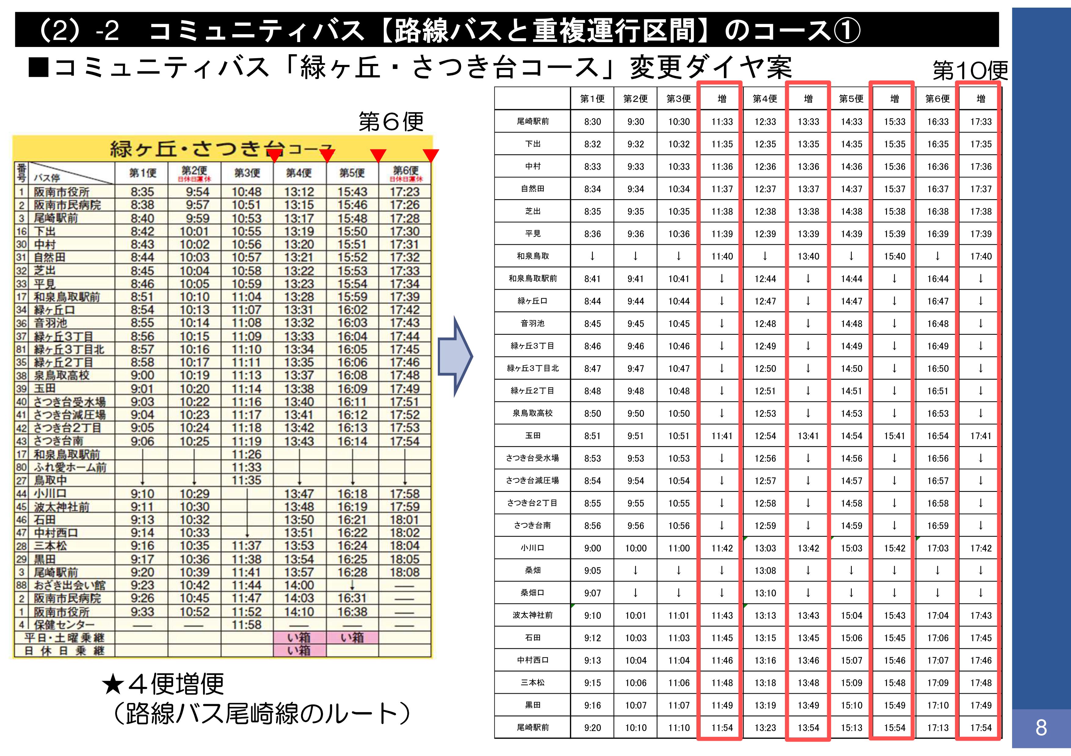 コミュニティバスは、現行のダイヤに加え、4便増便することになりますが、この増発便については、路線バス尾崎線のルートをそのまま通ることになります。