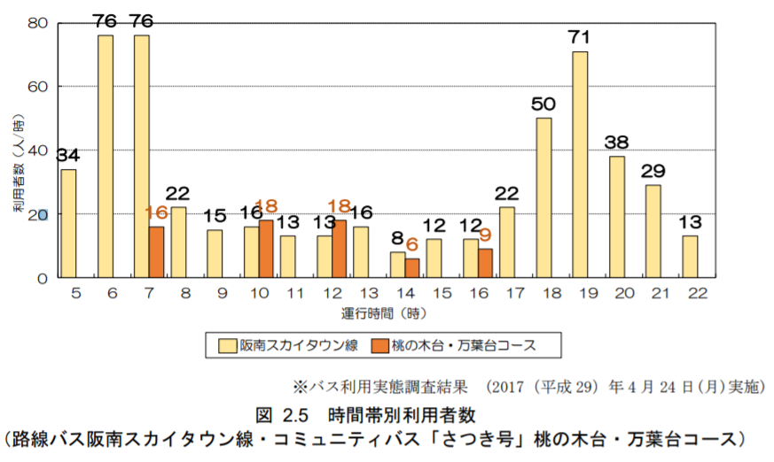 一方で、箱作駅前〜桃の木台〜箱作駅前コースでは、阪南スカイタウンから南海線を利用する通学生もおり、それらの学生が帰宅する15時台・16時台の便数が薄いのが若干気になりますが、「地域公共交通網形成計画」内の資料によりますと、阪南スカイタウン線については、17時台以降に利用者が増えることから、「16時台までコミュニティバスで運行」というのはある意味現状に沿った対応なのかも知れません。