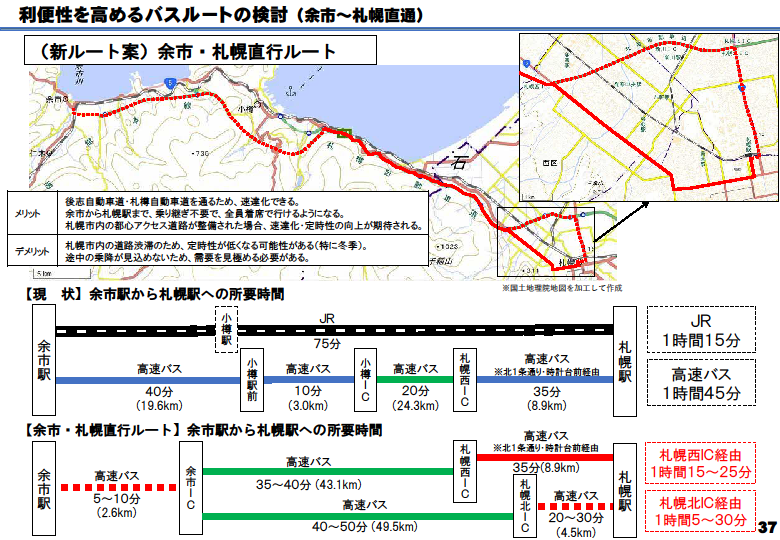 ・余市〜札幌駅への直通高速バスを設けることで、現在のJR線乗り継ぎで札幌へ向かうのと同等の所要時間で結べる新ルートを開設