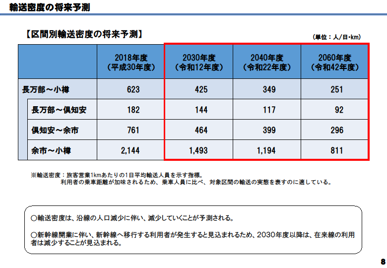 そのため、小樽〜余市間の輸送密度も将来的に減少が予想され、2050年度には811人/日・kmとなる予測も示されています。