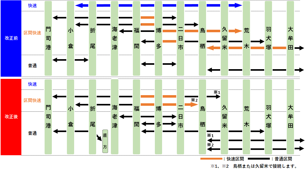 鳥栖→久留米・大牟田方面の列車本数を見直し、荒木〜荒尾間の最終列車の時刻を20分程度繰り上げ。