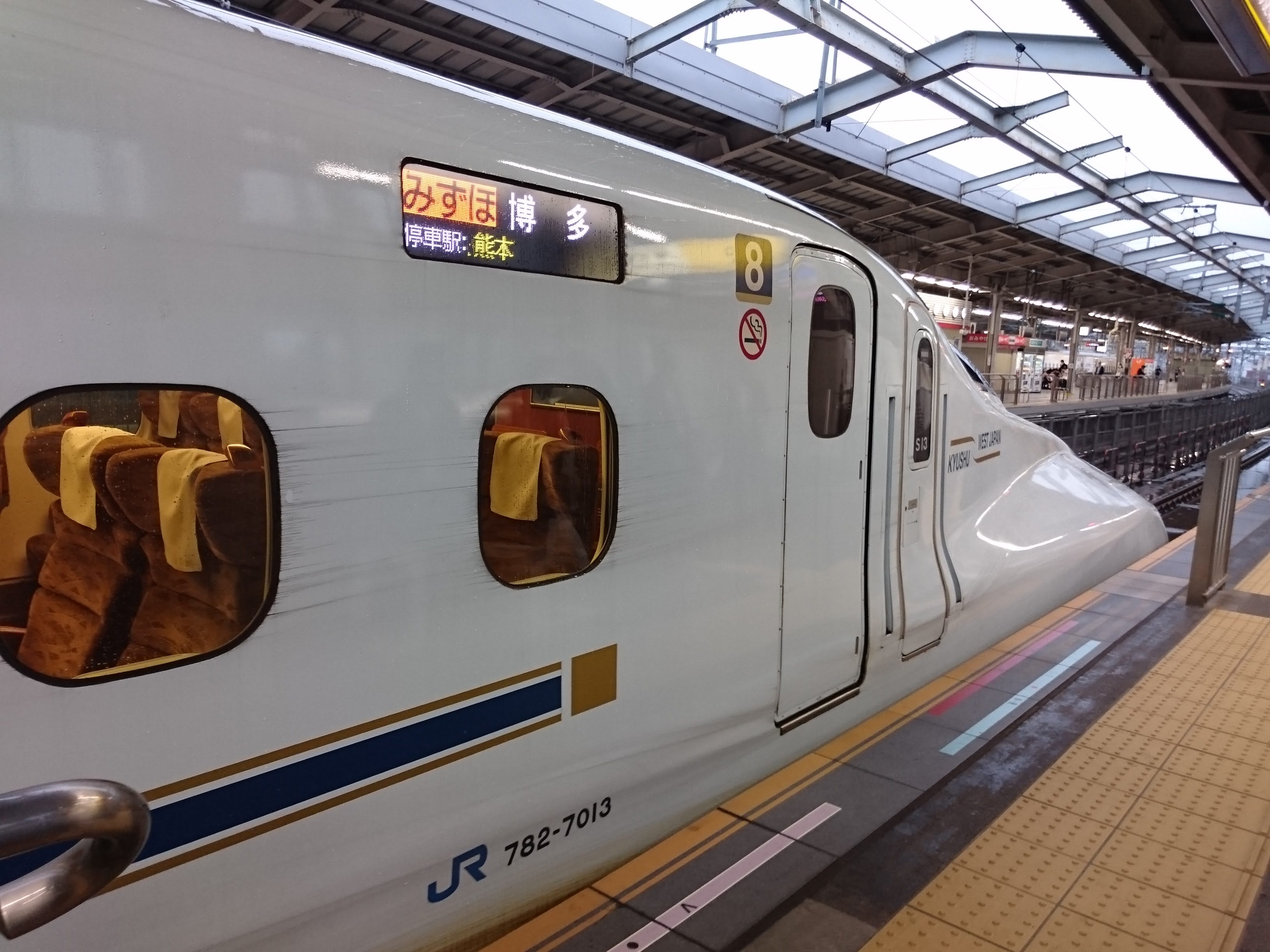 ▲新大阪駅に停車中の「みずほ」(2016年4月の熊本地震の影響で、博多行きとなっている写真です。)