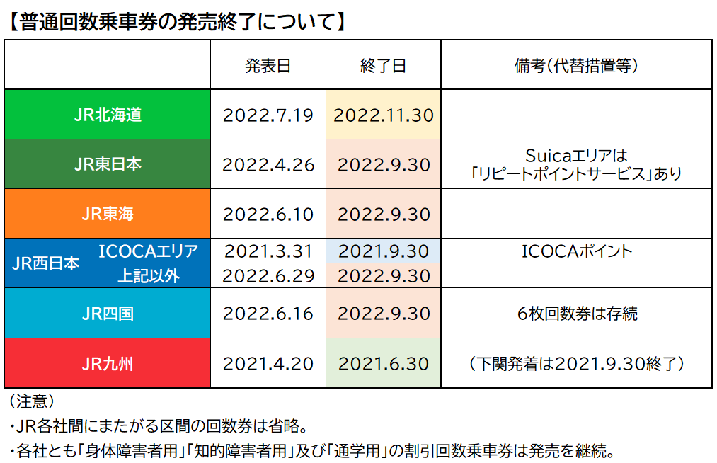 注目は、回数券終了に伴う代替措置の有無で、JR東日本は「Suica」の「リピートポイントサービス」、JR西日本は「ICOCAポイント」がありますが、その他の各社では代替措置は無く、実質的な値上げ、となります。