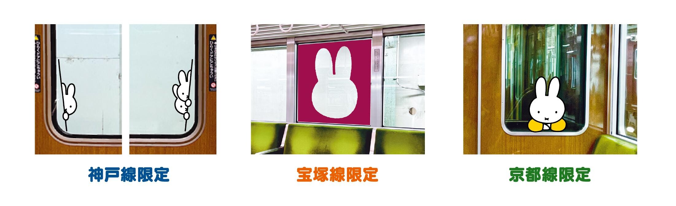 神・宝・京の各路線で1編成ずつ運行されますが、各線ごとに異なるヘッドマークを掲出するほか、車内でも各線オリジナルのステッカーが貼られるとのことですので、各線の「ミッフィー号」の撮り比べや乗り比べを楽しめるものとなっています。