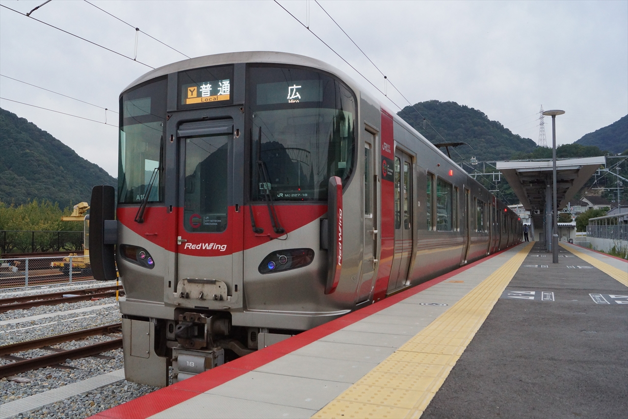 ▲可部線・あき亀山駅で発車を待つ227系。
