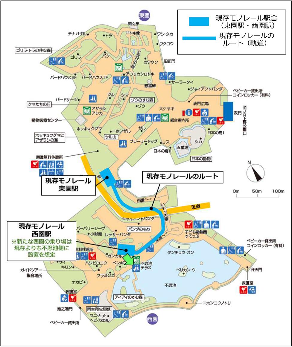 ・新たな西園の乗り場は、現存の上野動物園モノレールの西園駅舎よりも不忍池(しのばずのいけ)側に移動した位置に設置する。